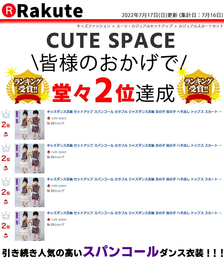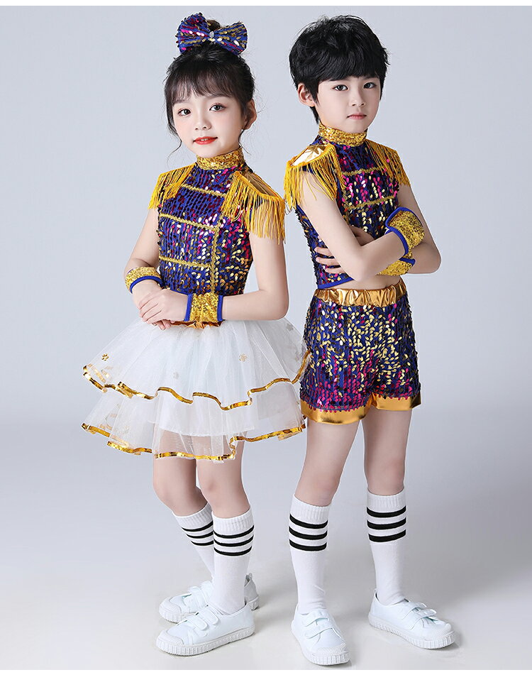 商品説明商品名 こちらの商品はキッズダンス衣装です。 様々な演出で大活躍のスパンコールダンス衣装。 個人発表会服として勿論キラキラ光って大注目されます。 スカートセットとショートパンツの2タイプがお揃って、団体演出服としても大お勧めいたします。 ハイネックのトップスはとても元気でかっこいいです。 肩位にある流蘇の飾りも動きに揺れて演出効果に加点できます。 2タイプのトップスもバックファスナーのデザインなので、着脱げ容易で子供たちは着楽ちゃん 可愛いチュチュスカートの裾にゴールドのラインが付け、さらにお洒落です。 画像通りの豪華なセットで満足できます。素晴らしいダンス衣装セットアップだと思います。 素材ポリエステル、その他生産国中国サイズ 【100】 参考身長90-100cm 参考体重14-16kg ------------ 【110】 参考身長100-110cm 参考体重16-19kg ------------ 【120】 参考身長110-120cm 参考体重19-22kg ------------ 【130】 参考身長120-130cm 参考体重22-27kg ------------ 【140】 参考身長130-140cm 参考体重27-32kg ------------ 【150】 参考身長140-150cm 参考体重32-38kg ------------ 【160】 参考身長150-160cm 参考体重38-45kg ------------ セット内容 女の子-トップス・スカート・髪飾り・腕カバラー*2 男の子-トップス・ショートパンツ・腕カバラー*2 注意 PC環境・光の具合により、色や素材のイメージが写真と若干異なる場合がございます。 モデル・写真に使用されているアクセサリー・小物は別途記載が無い限り付属いたしません。 商品に不良があった場合は、商品到着から5日以内にご連絡いただければご返金・交換対応させて頂きます。 商品のサイズは、全て平置きにて外寸を測定しております。 商品によっては+-0.5cm〜1cmの誤差が発生してしまう場合がございます。 該当商品は他店と在庫共有です。タイミングにより、在庫ズレが生じる場合がございます。予めご了承ください。