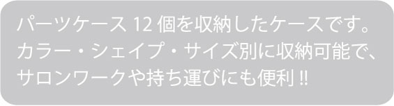スワロフスキーやアクリルストーン。 小さめのデコパーツなどをスッキリ収納。 パーツケース12個を収納したケースです。 カラー・シェイプ・サイズ別に収納可能で、 サロンワークや持ち運びにも便利!! ★画像のようにカラーパウダーを入れてもGOOD! ※カラーパウダーはついておりません 【セット内容】 ★パーツケース12個 ★パーツケース収納ケース1個 【パーツケースサイズ】 幅:約3cm 奥行き:約3cm 高さ:約1.5cm 【パーツケース収納ケースサイズ】 長さ:約12.5cm 奥行き:約9.5cm 高さ:約2cm 【その他のストーンケースはコチラ】
