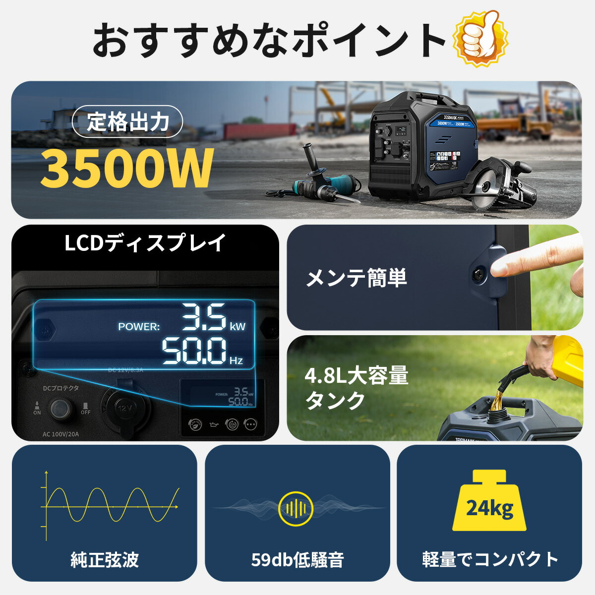 メーカー希望小売価格はメーカーカタログに基づいて掲載しています 商品説明 ■型番 JM3800iS 発電機 インバーター ■商品仕様 定格出力:3.5kVA 最大出力:3.8kVA 定格周波数:50/60Hz(切替式) ACコンセント:100V/20A(2口、合計最大2000Wまで対応)、100V/30A(1口) シガーソケット:12V/8.3A(1口) 連続運転時間:約6h~2.5h(エコモード~定格負荷) エンジン種類:181cc空冷4ストロークOHVエンジン 使用燃料:無鉛ガソリン 燃料タンク容量:4.8L エンジンオイル:4サイクル用、粘度SAE10W-30以上 オイル規定量:0.45L 始動方式:リコイルスタータ式 寸法(全長×全幅×全高):490*305*455mm 乾燥重量:24kg ■ポイント1 ★3.5kw高出力インバーター発電機 強力な4ストロークエンジン搭載、定格出力3.5kVA、排気量181cc、従来の同レベルインバーター発電機より軽量で高出力。電子レンジや炊飯器はもちろん、業務用電動工具や工事用機械などもしっかり対応します。 ■ポイント2 ★デジタル表示なので一目でわかる 出カワット数、電圧、周波数、運転時間等をデジタル表示するLCDディスプレイが搭載され、発電機の出力目安や運転状況を迅速かつ直感的に把握できます。 ■ポイント3 ★メンテナンスを改善 メンテナンスカバーにネジが1つだけで、引っ掛け機構も付いていますので、メンテナンスがより簡単になりました。 ■ポイント4 ★使いやすさを向上 携帯性の高いインバーター発電機の上、3in1スイッチ(停止、起動、運転)で簡単にエンジン始動、停止ができます。また、マルチスイッチとリコイルスタータの操作系を同一面に集約して扱いやすさを向上させました。 ■ポイント5 ★燃料計付き 視覚的な燃料ゲージは残りのガソリン量を示し、タイムリーな補充に便利です。 ■ポイント6 ★並列運転機能で最大6300Wの出力を得る JM3800iS発電機は並列運転端子を標準装備。別売りの並列運転ボックスで2台を接続し、2台をそれぞれ順に始動させることで定格出力6300Wを得ることができ、1台では対応できない大きな電力を必要とする電子機器への対応が可能となりました。 ■ポイント7 ★低騒音設計 新開発マフラーと防音システムにより、1/4負荷時59dbの静粛性を実現しました。 ■ポイント8 ★正弦波インバーター搭載 パソコン、スマートフォン、タブレットなどの精密機器の充電に必要な正弦波電力インバーターを搭載、商用電源と同レベルの良質で滑らか波形を作り出して出力するため、安心で充電できます。必要とする電力に合わせて、周波数スイッチも簡単に調整できます。 ■ポイント9 ★多彩な出力ポート 2WAY(DC出力、AC出力)の出力式で多用途に対応。停電や災害時など、非常用電源にも最適です。 ■ポイント10 ★安全面を重視、保護機能付 LEDランプの表示によって発電機の状態を確認できます。 ◎オイル警告灯 オイル不足によりエンジンが始動できないことを知らせたり、エンジンの焼き付きを防いだりします。 ◎出力表示ランプ・ACリセットスイッチ 故障時:出力表示ランプが赤く点滅 電気供給の再開:ACリセットスイッチを押してリセットし、出力表示ランプが緑に点灯 ◎過熱保護装置【AC/DCプロテクタ】 使用温度範囲に超えた時に働きます。 ◎出力表示灯 発電機が正常に作動していることをお知らせします。 ■ポイント11 ★エコモードで省エネ・長時間運転 使用する電力量に応じて燃料の消費と騒音を抑えるエコモード搭載。 エコモードの発電で最大8時間の長時間運転も可能です。また、エコモードがONになる時、インジケータが点灯し、視認性も向上させてました。 ■ポイント12 ★信頼できる安全品質 JESIMAIK発電機は性能検定から品質保証へ、品質の維持、向上に常に力を入れ、より信頼性の高い製品を提供し続けることをモットーに弛まぬ努力を重ねております。 ■安全にご使用いただくために ● ご購入時、発電機にはエンジンオイル・燃料は入っておりません。 ● 発電機を使用すると排気ガスが出ます。一酸化炭素中毒の恐れがあるため、屋内、倉庫、車内、井戸、トンネル、タンク内など換気の悪い場所では使用しないでください。 ● ご使用前には、必ず取扱い説明書をお読みください。 ■返品について 商品到着後、商品に問題がある場合、違う商品が届いた場合、返品、交換について、お手数をおかけいたしますが商品到着後7日以内にメール、もしくはお電話にてご連絡下さい。 お客様都合による返品、交換 未開封・未使用のもの(届いた時と同じ状態の商品)は商品到着後7日以内にご連絡をいただいた場合原則対応いたします。 ※返品送料はお客様にご負担いただきます。 ※返送時に着払いは受け取りしかねます、ご遠慮ください。 開封後、商品の初期不良にあたる場合による返品、交換 ※送料・手数料等全て弊社負担にて返品・交換対応をさせていただきます。 ※レビューにて報告いただきますと気づくことができない場合がございます。まずは直接ご連絡をいただけますと幸いです。 (以下のキーワードの興味がある方ぜひ商品ページをご覧ください:JESIMAI
