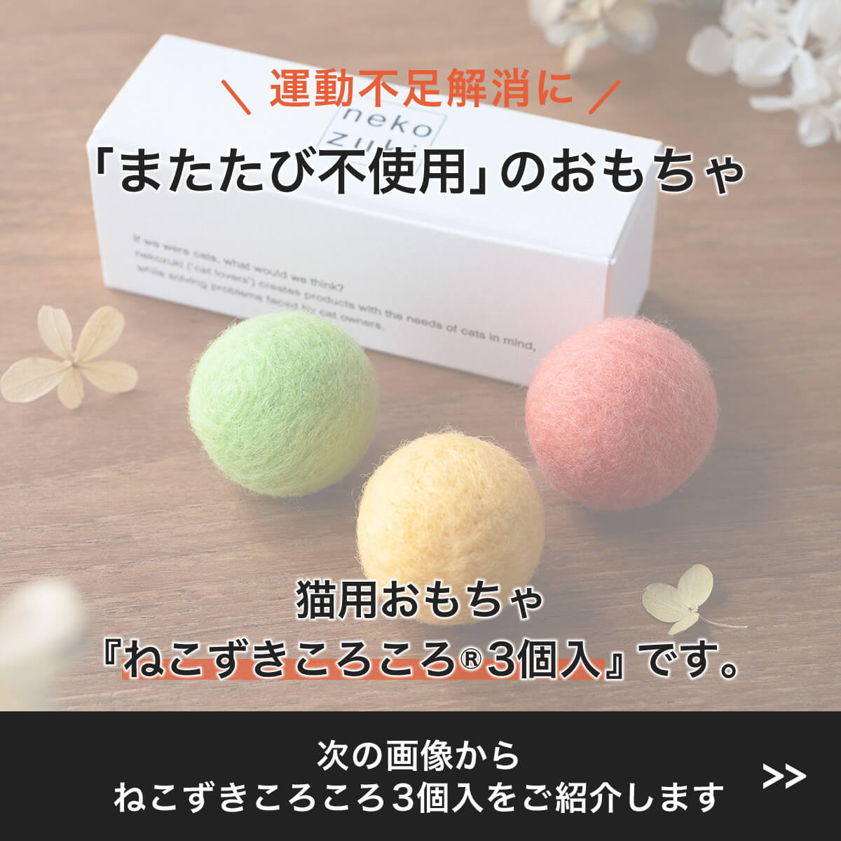 よく一緒に購入されている商品夢中で遊ぶ 猫 大喜び おもちゃ ボール 誤飲1,100円猫 じゃらし おもちゃ 安全 設計 日本製 2,000円猫 おもちゃ ボール 転がる 音が鳴る 日本1,550円 日本製 猫 おもちゃ ねこずきころころ 羊毛 ボール 3個 セット の解説 室内猫のために岩手県で開発された猫用の玩具です。国産、岩手の職人さんが手作りをした羊毛ボールのオモチャです。機械的な一括生産にはない、一つ一つ手作り(ハンドメイド)だからこその独特な自然な風合いも、nekozukiおもちゃの特徴です。ほっこりしたデザインとカラーはインテリアになじみます。猫用品専門店がお薦めする猫専用おもちゃです。 日本製 猫 おもちゃ ねこずきころころ 羊毛 ボール 3個 セット の詳細 商品名 ねこずきころころ(nekozukikorokoro/ねこずきコロコロ/ネコズキコロコロ) 一般名称 ボール、おもちゃ(オモチャ/玩具/トイ/TOY/遊び道具) メーカー名 nekozuki(ねこずき/猫好き/猫ずき) メーカー型番 1802030000 商品サイズ 3.5cm前後 商品の形状 球体、ボール 色(カラー) 色はお任せください。 デザインモチーフ シンプル、上品 デザインイメージ おしゃれ(オシャレ/お洒落)デザイン(モダン/スタイリッシュ)かわいい(可愛い/カワイイ) 生産国 日本製(国産) 品質に関して 手作り品のためサイズ等には多少の誤差が生じる場合がございます。予めご了承願います。 ご注意ください ボールの色は当店にお任せください。本製品は未開封・不良品以外の返品交換は衛生上受け付けておりません。商品にトラブルや不具合があった場合は、商品到着後7日以内にご連絡ください。 安全上のお知らせ 猫のおもちゃ以外でのご利用はお控えください。よく観察のうえ、ご使用は飼い主さまの判断にてお願いいたします。破損がみられた場合は使用を中止してください。 機能 猫さんが誤飲をしづらく(誤飲しない)、手で抱えたり猫さん自身が持ち運んだりしやすいサイズです。またたび不使用、舐めても安全なように製作。天然素材のおもちゃです。 特徴 転がるのを追いかけたりくわえたりキャッチしたり、猫さんの可愛い(かわいい・カワイイ)姿がみれるかもしれません。岩手の職人さんが手作りをした国産おもちゃ羊毛ボールです。猫さんへの贈りものにもオススメです。お洒落(おしゃれ・オシャレ)な見た目はお部屋に転がっていても猫用品とわからないと好評です。 用途 ストレス解消、一人遊び(ひとり遊び)、運動不足解消 お手入れ方法 汚れ等は乾いたタオルで拭いてください。濡れた場合は陰干ししてください。 使用方法 猫のおもちゃ 使用場所 室内 保存方法 遊んだ後は誤飲防止のため猫の手が届かない場所に保管して下さい。 素材 羊毛 (フェルト) 外部機関による認定 無し パッケージタイプ 箱 パッケージ商品数 1 配送 宅配便 送料 地域により異なります。 カテゴリ 遊び(遊ぶ)、道具 大分類 猫用品(ネコ用品、ねこ用品)、猫グッズ(ネコグッズ、ねこグッズ、猫goods、キャットグッズ、愛猫グッズ)、猫雑貨(ネコ雑貨、ねこ雑貨、猫雑貨屋)、猫アイテム(ネコアイテム、ねこアイテム)、猫用具(ネコ用具、ねこ用具)、ペット用品(ペットグッズ、ペットグッズショップ、ペットアイテム、ペット雑貨)、商品(アイテム、小物、インテリア) 販売 通販(ネットショップ/楽天/ショップ)、カタログ、専門店 対象の動物(アニマル/ペット) 猫、ねこ、ネコ、愛猫、キャット 猫種 鼻が低い短頭種の猫種から黒猫(クロネコ)、茶トラ(虎猫)、白猫、三毛猫(みけねこ、ミケ)、ハチワレ、サビ猫(錆び猫)、スコティッシュ(スコティッシュフォールド、スコティッシュフォールドロング)、アメリカンショートヘア、ブリティッシュショートヘア、マンチカン、ラグドール、ロシアンブルー、ソマリ、シンガプーラ、エキゾチックショートヘア、アビシニアン、ベンガル、ヒマラヤン、シャルトリュー、サイベリアン、ラガマフィン、オシキャット、トンキニーズ、エジプシャンマウ、スクーカム、バーマン、ペルシャ、バーミーズ、アメリカンワイヤーヘア、ターキッシュバン、コラット、ラパーマ、メインクーン、オリエンタルショートヘア、雑種猫(ミックス)、短毛種、長毛種などすべての猫種 体の大きさ 小型、中型、大型 猫の年齢 子猫、成猫、高齢猫(老猫/シニア猫/年寄り猫) 贈り物 当店のねこずきころころはプレゼントにも好評です。プレゼント(贈り物、プチギフト、ギフト)にオススメです。誕生日(バースデー)、クリスマス、お正月(お年賀)、バレンタイン、猫の日、長寿、内祝い、引越し祝い(引越祝い)、出産祝い、お見舞いなど。お気軽にお問い合わせください。 特集 日頃抱えているお悩みやあったらいいなをサポートする企画『ネコさんとの暮らしの大辞典』ランキング常連の人気商品、福袋、セットなど。安い、お得が一番ではなくネコさんとの暮らしに役立つ商品をあつめました。 ギフト包装 ラッピング(包装) ギフトメッセージ メッセージカード、バースデーカード 熨斗 対
