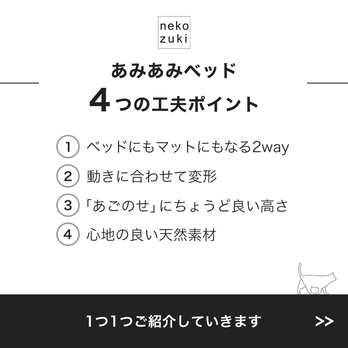 よく一緒に購入されている商品エリザベスカラー 猫 柔らかい 視界良好 獣4,990円~ふかふかで気持ちいいマット 猫 ベッド 日本5,000円猫 柔らかい 軽い首輪 名前と電話番号を刺繍 4,950円 ベッド 猫 あみあみベッドの解説 岩手の裂き織職人と開発した「裂き編み」、大きめサイズのベッドです。囲まれたところが大好きな猫さんに、ほっこり落ち着く空間をプレゼントしませんか?かご型の丸い形状でカーペットやフローリングなどお部屋のインテリアともなじみます。子猫、成猫、高齢シニア猫(猫、ネコ、ねこ)全年齢、全猫種に対応している国産の安心安全な猫グッズです。通気性良く、オールシーズン(一年中)使用可能です。動きに合わせて変形するのでストレスフリー。また、あごのせにちょうど良い高さです。 ベッド 猫 あみあみベッドの詳細 商品名 あみあみベッド(Amiamiベッド) 一般名称 猫用ベッド(ベット/クッション/マットレス/寝床/ふみふみ/猫ベッド/ネコベッド)ペットベッド ペットクッション メーカー名 nekozuki(ねこずき/猫好き/猫ずき) メーカー型番 ホワイト(1901012251)、グレー(1901012292) 商品サイズ 縦38cm前後、横38cm前後、高さ15cm前後 商品の形状 丸(ラウンド) 色(カラー) ホワイト、グレー*天然素材・手作り品のため色、形の誤差がございます。予めご了承願います。 デザインモチーフ シンプル、上品、ナチュラル、ふわふわ、ふかふか デザインイメージ おしゃれ(オシャレ/お洒落)+デザイン(モダン/スタイリッシュ)+高級(上質/高品質) かわいい 北欧 生産国 日本製(国産) 品質に関して デニムを使っている手作り品のため個性が一つ一つ異なります。様々な表情があります。自然が生み出した、やさしく味わい深い表情をお楽しみください。そのような事情から色味や風合いのご指定はお受けできかねます。デニム独特の香りがします。香料は添加しておりません。商品の特性をご納得頂いた上、ご購入のほどお願いいたします。 ご注意ください 本体が濡れた場合は水分が残らないように早めに拭き取ってください。本体を濡らしたままにしたり、濡れた布を本体の上で放置しないでください。デニムを使用しているのでお洗濯の際色落ちする場合があります。 安全上のお知らせ 本来の用途以外でのご使用はしないでください。火気には近づけないでください。 機能 お気に入り空間になじむ国産デニム素材で耐久性のあるベッドです。猫専用のざぶとんozabu(おざぶ)ROUNDがぴったりサイズです。 特徴 岩手の裂き織職人と開発した「裂き編み」のベッドです。猫さんがベッドを使わない(嫌がる/気に入らない/来ない/乗らない/入らない)ことや、選び方にお悩みの方へおすすめ。猫さんの好みや成長に合わせて変形(高さ変更/コンパクトに変形)します。通気性が良いため夏用としても、暖かい「ぽかぽかマット(別売)」で寒さ対策して秋冬用としても通年使用可能です。どんなお部屋にもなじむ、シンプルなデザインです。柔らかいクッション付き。 用途 猫用 ベッド 多頭飼い お手入れ方法 洗い方:手洗い、もしくは洗濯機の手洗いモードをご使用ください。(洗える/丸洗い/洗濯可能) 洗剤は弱アルカリ性か中性洗剤をお使いになり、塩素系漂白剤の使用はお避けください。色落ちの恐れがありますので、他の物と分けて洗ってください。ドライクリーニングはお避けください。 乾かし方:洗濯機での脱水は手洗いモードをご使用ください。乾燥機の使用はお避けください。風通しの良い日陰で干してください。吊るし干し可能です。よく乾燥させてください。洗濯・乾燥で縮む場合がございます。予めご了承願います。 使用方法 猫さんがお気に入りの場所に置いてご使用ください。猫用ベッド(ベット/寝床) 使用場所 室内(室内用 屋内用)室内飼い 保護猫 保存方法 日光が直接あたるところ、温度の高いところや湿気の多いところでのご使用は変質・変形・変色のもととなりますのでお避けください。 素材 ベッド:デニム 中敷き:綿麻、綿(中身) 外部機関による認定 無し パッケージタイプ 袋 パッケージ商品数 1 配送 宅配便 送料 地域により異なります カテゴリ 猫用 ベッド、マット(兼用) 大分類 猫用品(ネコ用品、ねこ用品)、猫グッズ(ネコグッズ、ねこグッズ、猫goods、キャットグッズ、愛猫グッズ)、猫雑貨(ネコ雑貨、ねこ雑貨、猫雑貨屋)、猫アイテム(ネコアイテム、ねこアイテム)、猫用具(ネコ用具、ねこ用具)、ペット用品(ペットグッズ、ペットグッズショップ、ペットアイテム、ペット雑貨)、商品(アイテム、小物、インテリア) 販売 通販(ネットショップ/楽天/ショップ)、カタログ、専門店 対象の動物(アニマル/ペット) 猫、ねこ、ネコ、愛猫、キャット 猫種 鼻が低い短頭種の猫種から黒猫(クロネコ)、茶トラ(虎猫)、白猫、三毛猫(みけねこ、ミケ)、ハチワレ、サビ猫(錆び猫)、スコティッシュ(スコティッシュフォールド、スコティッシュフォールドロング)、アメリカンショートヘア、ブリティッシュショートヘア、マ