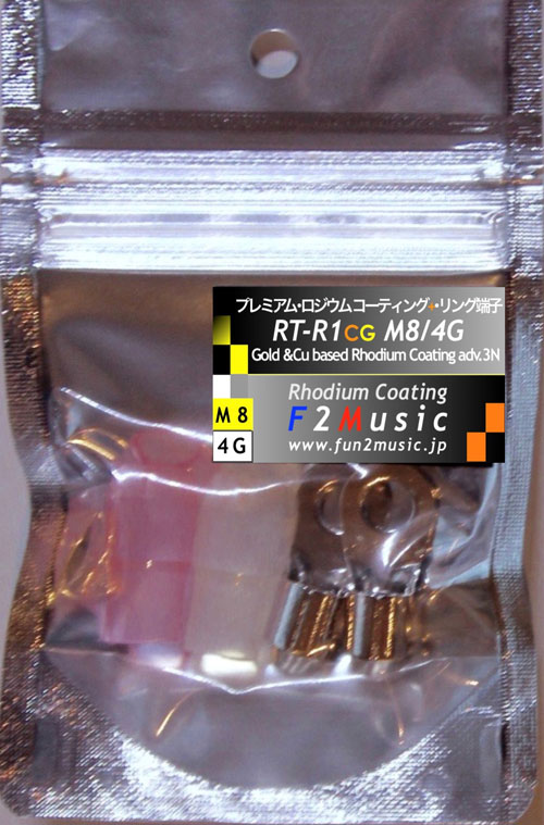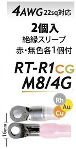 F2MUSIC RT-R1CG M8/4G プレミアムロジウムコーティング 電源ライン用 リング端子M8ネジ 4ゲージ/22sqのケーブル対応 2個入り 絶縁スリープ赤・無色各1個入り