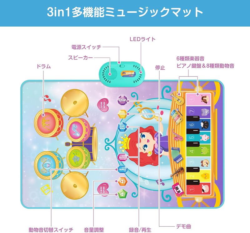 【スーパーセール】ピアノマット おもちゃ ドラムセット 多機能 音楽マット 折り畳み ミュージックマット 8鍵盤 録音再生 音量調整 防水素材 滑り止め 知育玩具 音楽プレイマット 子供 女の子 男の子 誕生日 クリスマス 新年プレゼント プリンセス