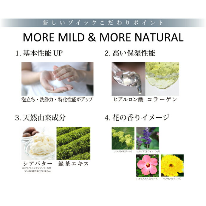 【ショート】 中・短毛の成犬・成猫に最適なシャンプーとリンスです。 ペアユースでツヤとハリのあるサラッとした軽い仕上がりになります。 ダブルコート犬やドッグショー用として最適です。 内容量:300ml 成分●ショート シャンプー 低刺激アミノ酸系ベース・カチオン化コンディショニング成分・ハイビスカスエキス(保湿成分)・ヒアルロン酸(保湿成分)・コラーゲン(保湿成分)・緑茶エキス(保湿成分)・シアバター(うるおい成分) ● ショート リンス カチオン化コンディショニング成分・コンディショニング成分・ハイビスカスエキス(保湿成分)・ヒアルロン酸(保湿成分)・コラーゲン(保湿成分)・緑茶エキス(保湿成分)・シアバター(うるおい成分) 香り:ハイビスカスの花の香りをイメージ。華やかなフルーティフローラルの香り。 適用犬種:ミニチュアダックスフンド・プードル・ポメラニアン・短くカットした犬・短毛猫などにおすすめ 原産国:日本 【ロング】 長毛の成犬・成猫に最適なシャンプーとリンスです。 ペアユースでうるおいのあるしっとりとした仕上がりで、毛並みにまとまりとツヤをあたえます。 ドッグショー用として最適です。 内容量:300ml 成分●ロング シャンプー 低刺激アミノ酸系ベース・カチオン化コンディショニング成分・トウキンセンカエキス(保湿成分)・ヒアルロン酸(保湿成分)・コラーゲン(保湿成分)・緑茶エキス(保湿成分)・シアバター(うるおい成分) ●ロング リンス カチオン化コンディショニング成分・コンディショニング成分・トウキンセンカエキス(保湿成分)・ヒアルロン酸(保湿成分)・コラーゲン(保湿成分)・緑茶エキス(保湿成分)・シアバター(うるおい成分) 香り:キンセンカの花の香りをイメージ。落ち着きのあるフローラルムスクの香り。 適用犬種:ヨークシャテリア・マルチーズ・シーズー・ロングコートチワワ・長毛猫におすすめ 原産国:日本 【パピドール】 デリケートな仔犬・仔猫の皮膚、被毛のためのシャンプーとリンスです。 ペアユースでふんわり軽い仕上がりになります。 仔犬はもちろん皮膚の弱い成犬やシニア犬にもお使いいただけます。 容量:300ml 成分●パピドール シャンプー 低刺激アミノ酸系ベース・カチオン化コンディショニング成分・ナツメエキス(保湿成分)・ヒアルロン酸(保湿成分)・コラーゲン(保湿成分)・緑茶エキス(保湿成分)・シアバター(うるおい成分) ●パピドール リンスカチオン化コンディショニング成分・コンディショニング成分・ナツメエキス(保湿成分)・ヒアルロン酸(保湿成分)・コラーゲン(保湿成分)・緑茶エキス(保湿成分)・シアバター(うるおい成分) 香り:ナツメの花の香りをイメージ。やさしいグリーンフローラルの香り。 適用犬種:仔犬・仔猫・皮膚の弱い成犬や成猫などにおすすめ 原産国:日本 【ホワイトニング】 ガンコな汚れを落とし、美しい被毛をよみがえらせるためのシャンプーとリンスです。 ペアユースで被毛に輝きとすべりをあたえ、被毛本来の美しい色調をよみがえらせます。 内容量:300ml 成分●ホワイトニング シャンプー 低刺激アミノ酸系ベース・カチオン化コンディショニング成分・サルビアエキス(保湿成分)・ヒアルロン酸(保湿成分)・コラーゲン(保湿成分)・緑茶エキス(保湿成分)・クレンジング成分 ●ホワイトニング リンス カチオン化コンディショニング成分・コンディショニング成分・サルビアエキス(保湿成分)・ヒアルロン酸(保湿成分)・コラーゲン(保湿成分)・緑茶エキス(保湿成分)・ヤシ油由来オイル成分(うるおい成分) 香り:サルビアの花の香りをイメージ。清潔感のあるマイルドフローラルの香り。 適用犬種:全毛色の犬種・猫種・汚れがひどい場合におすすめ 原産国:日本【ご注意(免責)事項】当店では、サイト上に最新の商品情報を掲載するよう努めておりますが、メーカーの都合等により、商品規格や仕様(容量・成分・パッケージ・原産国など)が予告なく変更される場合がございます。このため、実際にお届けする商品と商品ページ上の情報表記が異なる場合がございますので、ご使用前には必ずお届けした商品の商品ラベルや注意書きをご確認ください。また、商品情報についてページ表記以外の詳細が必要な場合は、メーカー等にお問合せください。≫ゾイック各種 1本でお求めの場合はこちら!≪