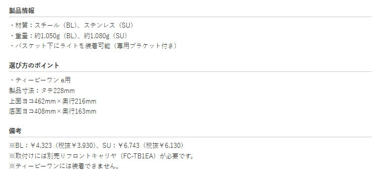 TB1e用バスケット BK-TB1E 学生カバンのサイズに合わせたワイヤーバスケット SU P6578 製品情報 ・材質:ステンレス(SU) ・重量:約1,080g(SU) ・バスケット下にライトを装着可能(専用ブラケット付き) 選び方のポイント ・ティービーワン e用 製品寸法:タテ228mm 上面ヨコ462mm×奥行216mm 底面ヨコ408mm×奥行163mm 備考 ※取付けには別売りフロントキャリヤ(FC-TB1EA)が必要です。 ※ティービーワンには装着できません。