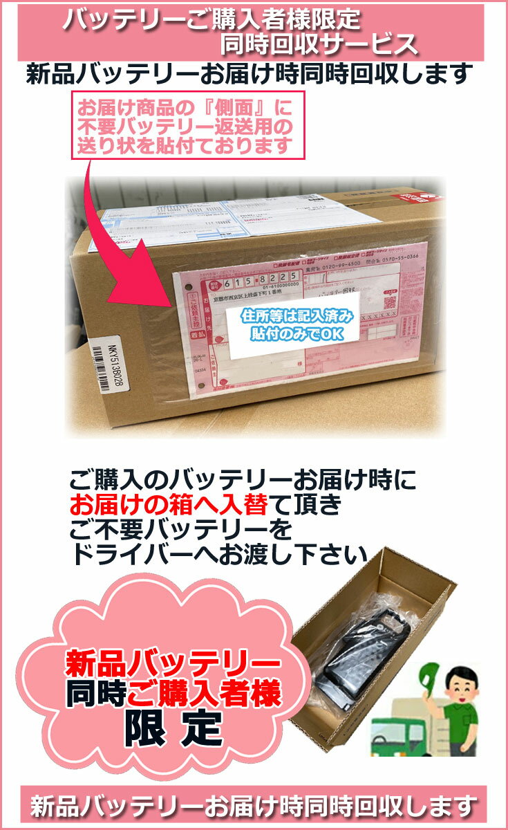 ※回収後のご不要バッテリーは、即廃棄となります為 ご返却は出来ません。予めご了承下さいませ。 ◆新品バッテリーご購入者様は、こちらの【980円のチケット】をご購入下さい。 ◆不要バッテリー回収のみ単品購入希望のお客様は、【1800円のチケット】をご購入下さい。 1,800円回収のみのご希望はコチラへ ■ご不要になった電動自転車のバッテリーを弊社が責任をもって処分いたします。 ■ご利用方法について 1、液漏れしやすい開放型や、破損したバッテリーはビニール袋などに入れて 液体の漏れがない様にしてください。 2、当店で新品バッテリーご購入のお客様は、お届けと同時にご不要バッテリーを 回収させて頂きます。お届けのバッテリー箱を開けて、中身を廃棄バッテリーに 入れ替えてドライバーへお渡しください。 返送用伝票(住所記入済み着払送り状)は、箱側面に貼り付けております。 必ずお届けの箱をご使用ください。 別の箱で返送され梱包サイズが超過した場合、差額を請求させて頂きます。 回収後のご不要バッテリーは、即廃棄となります為 ご返却は出来ません。予めご了承下さいませ。