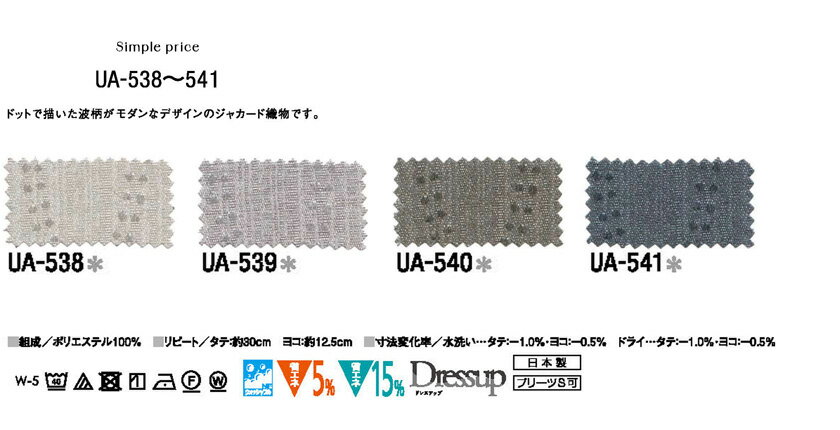 商品名ドレスアップ(形態安定加工) 約1.5倍ヒダ 2つ山 ドレープカーテン備考タテ使い上部は「ぐらつき防止アジャストフック」を使用し、ドレープのサイド・裾部は表面に縫い目が目立ちにくい「すくい縫い」を採用しています。(生地の特性上、シアーと一部のドレープは本縫いです。)※グレードアップ縫製に形態安定加工であるドレスアップ加工を施したものがドレスアップ縫製です。カーテン幅はレール幅の1.05〜1.1倍をおすすめします。メーカー希望小売価格はメーカーカタログに基づいて掲載していますバリエーションUA-538〜541 _ _ _ _ _ _ _ _ _ _ _ _スタンダードD(形態安定加工) 約1.5倍ヒダ 2つ山 約2倍ヒダ 3つ山 _ _ _ _ _ _ _ _ _ _ _ _グレードアップ 約1.5倍ヒダ 2つ山 約2倍ヒダ 3つ山 _ _ _ _ _ _ _ _ _ _ _ _グレードアッププリーツS 約2倍ヒダ 3つ山 _ _ _ _ _ _ _ _ _ _ _ _シームベール 完全2倍ヒダ 3つ山 _ _ _ _ _ _ _ _ _ _ _ _ドレスアップ(形態安定加工) 約1.5倍ヒダ 2つ山 約2倍ヒダ 3つ山 _ _ _ _ _ _ _ _ _ _ _ _フラット 約1.0倍ヒダなし _ _ _ _ _ _ _ _ _ _ _ _フラットD(形態安定加工) 約1.0倍ヒダなし _ _ _ _ _ _ _ _ _ _ _ _フラットウェーブD(形態安定加工) 約1.0倍ヒダなし送料について離島や中継手数料の発生する地域は、別途地域料が必要です。返品・交換について原則としてお受けできません。UA-538 UA-539 UA-540 UA-541UA-538〜541タテ使い ドレスアップ(形態安定加工) 約1.5倍ヒダ 2つ山 ドレープカーテン一覧はここをクリック↓一覧はここをクリック↓UA-538〜541 _ _ _ _ _ _ _ _ _ _ _ _スタンダードD(形態安定加工) 約1.5倍ヒダ 2つ山 約2倍ヒダ 3つ山 _ _ _ _ _ _ _ _ _ _ _ _グレードアップ 約1.5倍ヒダ 2つ山 約2倍ヒダ 3つ山 _ _ _ _ _ _ _ _ _ _ _ _グレードアッププリーツS 約2倍ヒダ 3つ山 _ _ _ _ _ _ _ _ _ _ _ _シームベール 完全2倍ヒダ 3つ山 _ _ _ _ _ _ _ _ _ _ _ _ドレスアップ(形態安定加工) 約1.5倍ヒダ 2つ山 約2倍ヒダ 3つ山 _ _ _ _ _ _ _ _ _ _ _ _フラット 約1.0倍ヒダなし _ _ _ _ _ _ _ _ _ _ _ _フラットD(形態安定加工) 約1.0倍ヒダなし _ _ _ _ _ _ _ _ _ _ _ _フラットウェーブD(形態安定加工) 約1.0倍ヒダなし