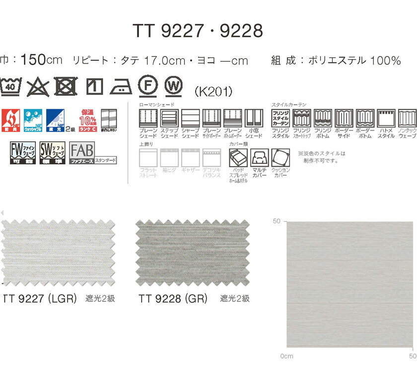 形態安定加工 防炎 ドレープカーテン商品名itto(イット) ソフトウェーブ縫製 約1.5倍ヒダ備考巾:150cm、リピート:タテ17.0cm・ヨコ-cm組成:ポリエステル100%※裏地付き仕様はお見積りとなります。※フラットカーテンは、レール寸法の1.4倍以上の幅サイズでご発注ください。幅・丈ともに1cm単位で製作いたします。メーカー希望小売価格はメーカーカタログに基づいて掲載しています送料について中継手数料の発生する地域は、別途地域料が必要です。その場合、一旦送料をご連絡致します。返品・交換について不良品・当方での手配間違い等以外は一切お受けできません。縫製(形態安定加工)仕様ヒダ倍率・開き方2.5倍2倍1.5倍フラット両開き片開き両開き片開き両開き片開き両開き片開きファインウェーブ縫製(上級形態安定加工)ヨコ使い裾刺繍ヨコ使いウエイトテープ付ヨコ使い下部3ッ巻タテ使い●●ソフトウェーブ縫製(形態安定加工)ヨコ使い裾刺繍ヨコ使いウエイトテープ付ヨコ使い下部3ッ巻タテ使い●●●●●●タテ使い(オーバーサイズ)●●●●●●スタンダード縫製(形態安定加工なし)ヨコ使い裾刺繍ヨコ使いウエイトテープ付ヨコ使い下部3ッ巻タテ使い●●●●●●TT9227 TT9228itto TT9227〜9228 形態安定加工 ドレープカーテンソフトウェーブ縫製 約1.5倍ヒダ 片開き一覧はここをクリック↓TT9227一覧はここをクリック↓縫製(形態安定加工)仕様ヒダ倍率・開き方2.5倍2倍1.5倍フラット両開き片開き両開き片開き両開き片開き両開き片開きファインウェーブ縫製(上級形態安定加工)ヨコ使い裾刺繍ヨコ使いウエイトテープ付ヨコ使い下部3ッ巻タテ使い●●ソフトウェーブ縫製(形態安定加工)ヨコ使い裾刺繍ヨコ使いウエイトテープ付ヨコ使い下部3ッ巻タテ使い●●●●●●タテ使い(オーバーサイズ)●●●●●●スタンダード縫製(形態安定加工なし)ヨコ使い裾刺繍ヨコ使いウエイトテープ付ヨコ使い下部3ッ巻タテ使い●●●●●●