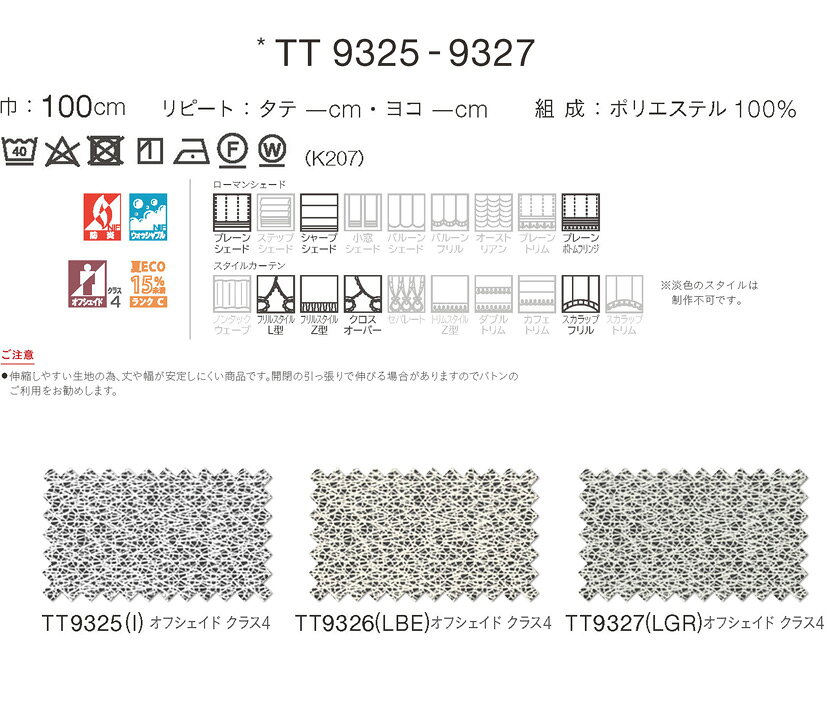 形態安定加工なし 防炎 レースカーテン商品名itto(イット) スタンダード縫製 約1.5倍ヒダ備考巾:100cm、リピート:タテ-cm・ヨコ-cm組成:ポリエステル100%※製品丈サイズが401cm以上の場合は特注品となります。料金についてはお問い合わせください。幅・丈ともに1cm単位で製作いたします。メーカー希望小売価格はメーカーカタログに基づいて掲載しています送料について中継手数料の発生する地域は、別途地域料が必要です。その場合、一旦送料をご連絡致します。返品・交換について不良品・当方での手配間違い等以外は一切お受けできません。縫製(形態安定加工)仕様ヒダ倍率・開き方2.5倍2倍1.5倍フラット両開き片開き両開き片開き両開き片開き両開き片開きファインウェーブ縫製(上級形態安定加工)ヨコ使い裾刺繍ヨコ使いウエイトテープ付ヨコ使い下部3ッ巻タテ使いソフトウェーブ縫製(形態安定加工)ヨコ使い裾刺繍ヨコ使いウエイトテープ付ヨコ使い下部3ッ巻タテ使いタテ使い(オーバーサイズ)スタンダード縫製(形態安定加工なし)ヨコ使い裾刺繍ヨコ使いウエイトテープ付ヨコ使い下部3ッ巻タテ使い●●●●●●●●TT9325 TT9326 TT9327itto TT9325〜9327 形態安定加工なし レースカーテンスタンダード縫製 約1.5倍ヒダ 両開き一覧はここをクリック↓TT9325一覧はここをクリック↓縫製(形態安定加工)仕様ヒダ倍率・開き方2.5倍2倍1.5倍フラット両開き片開き両開き片開き両開き片開き両開き片開きファインウェーブ縫製(上級形態安定加工)ヨコ使い裾刺繍ヨコ使いウエイトテープ付ヨコ使い下部3ッ巻タテ使いソフトウェーブ縫製(形態安定加工)ヨコ使い裾刺繍ヨコ使いウエイトテープ付ヨコ使い下部3ッ巻タテ使いタテ使い(オーバーサイズ)スタンダード縫製(形態安定加工なし)ヨコ使い裾刺繍ヨコ使いウエイトテープ付ヨコ使い下部3ッ巻タテ使い●●●●●●●●