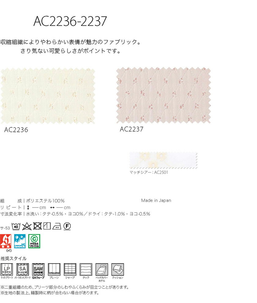 ▼サンゲツ AC オーダーカーテン LP仕様(形態安定加工)約1.5倍ヒダ 裾:折返し ▼AC2236~2237 ドレープ【カーテン幅291~363×カン下寸法81~100cm】