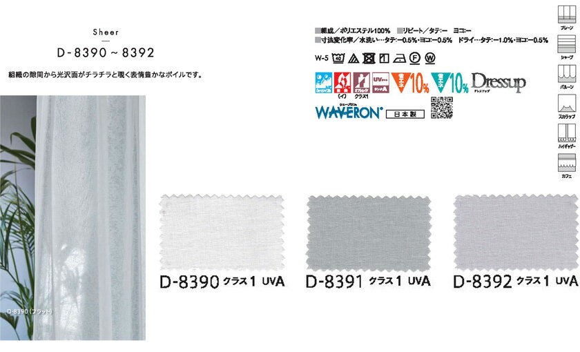 商品名D-8390〜8392 スタンダード シアー レースカーテン備考本縫い推奨仕上がり巾:レール巾の1.05〜1.1倍タテ使いの標準は、裾10cm3つ折です。2.5cm3つ折に変更が可能です。メーカー希望小売価格はメーカーカタログに基づいて掲載していますバリエーションD-8390〜8392 _ _ _ _ _ _ _ _ _ _ _ _スタンダード 約1.5倍ヒダ 約2倍ヒダ _ _ _ _ _ _ _ _ _ _ _ _フラット 約1.0倍ヒダなし _ _ _ _ _ _ _ _ _ _ _ _フラットD(形態安定加工) 約1.0倍ヒダなし _ _ _ _ _ _ _ _ _ _ _ _フラットウェーブ 片開きのみ 約1.0倍ヒダなし _ _ _ _ _ _ _ _ _ _ _ _フラットウェーブD(形態安定加工) 片開きのみ 約1.0倍ヒダなし _ _ _ _ _ _ _ _ _ _ _ _グレードアップ 約1.5倍ヒダ 約2倍ヒダ _ _ _ _ _ _ _ _ _ _ _ _ドレスアップ(形態安定加工) 約1.5倍ヒダ 約2倍ヒダ送料について離島や中継手数料の発生する地域は、別途地域料が必要です。返品・交換について原則としてお受けできません。D-8390 D-8391 D-8392D-8390〜8392 スタンダード シアー レースカーテン一覧はここをクリック↓一覧はここをクリック↓D-8390〜8392 _ _ _ _ _ _ _ _ _ _ _ _スタンダード 約1.5倍ヒダ 約2倍ヒダ _ _ _ _ _ _ _ _ _ _ _ _フラット 約1.0倍ヒダなし _ _ _ _ _ _ _ _ _ _ _ _フラットD(形態安定加工) 約1.0倍ヒダなし _ _ _ _ _ _ _ _ _ _ _ _フラットウェーブ 片開きのみ 約1.0倍ヒダなし _ _ _ _ _ _ _ _ _ _ _ _フラットウェーブD(形態安定加工) 片開きのみ 約1.0倍ヒダなし _ _ _ _ _ _ _ _ _ _ _ _グレードアップ 約1.5倍ヒダ 約2倍ヒダ _ _ _ _ _ _ _ _ _ _ _ _ドレスアップ(形態安定加工) 約1.5倍ヒダ 約2倍ヒダ