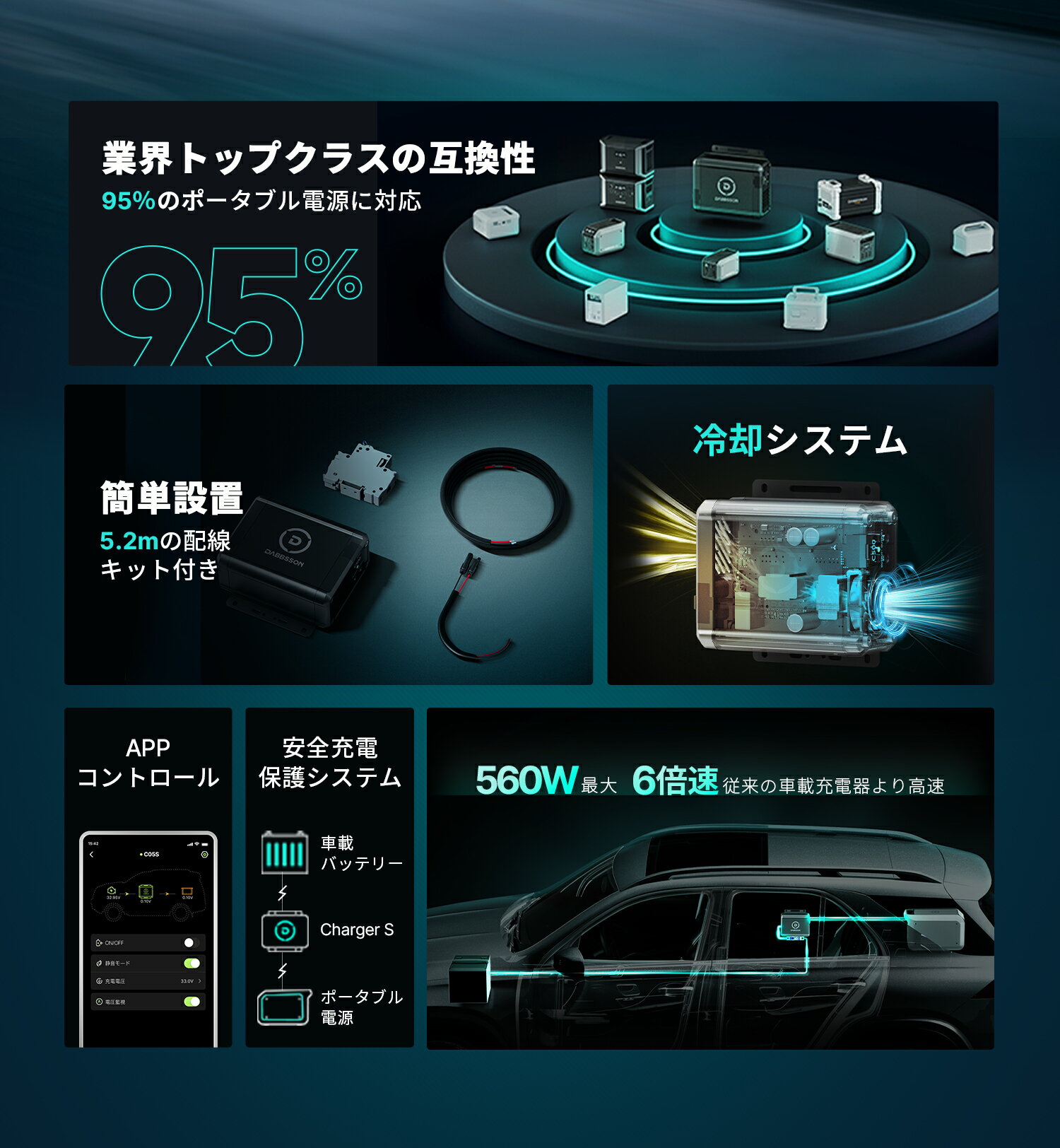保証について2年特徴【走行中でも最大6倍の急速充電】 Dabbsson Charger-Sは、車のオルタネーターから余剰電力を取り出し、ポータブル電源を通常のシガーソケットの約6倍のスピードで充電可能!1kWhのポータブル電源なら、最短2.5時間でフル充電。キャンプや車中泊に向かう道中で充電でき、到着後すぐに快適なアウトドアライフを楽しめます。 【スマート始動・停止機能】 独自の電圧監視アルゴリズムにより、車の始動・停止を自動検知。車やバッテリーに負担をかけず、安全かつ効率的に充電が可能です。 【多機種対応可能】 Charger Sは、Dabbssonの各種モデル(※充電速度の理由により、300E・600Lでの使用は推奨しておりません)に加え、他社製ポータブル電源の約95%にも対応可能。いつでもどこでも、スピーディーで快適な車載充電を実現します。 【スマートアプリ制御】 専用アプリで充電状況をリアルタイム確認。出力調整もスマホから可能で、車内にいながらポータブル電源をスマートに管理できます。 【高温下でも安定した性能】 内蔵ファンによる積極的な冷却機構を搭載。高温環境下でも安定した動作を維持し、接続機器の安全性を確保。さらに、電化製品の寿命延長にも貢献します。 【メーカー保証】 ご注文日から2年間の保証付き。不良・破損・誤納品、または正常使用による不具合の場合は、無料修理・交換対応いたします。アフターサポートも万全です。ご注意【発送について】 複数の商品を購入した場合、パッケージは分けられますので、お受け取りにご注意ください。 製品到着後は、Charger-SおよびDabbssonポータブル電源をアプリにて最新バージョンへアップデートしてください。