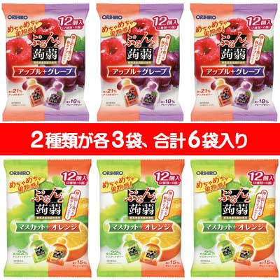 【オリヒロ】12個ぷるんと蒟蒻ゼリーパウチ〈アップル+グレープ〉・〈マスカット+オレンジ〉(2種×各3袋)