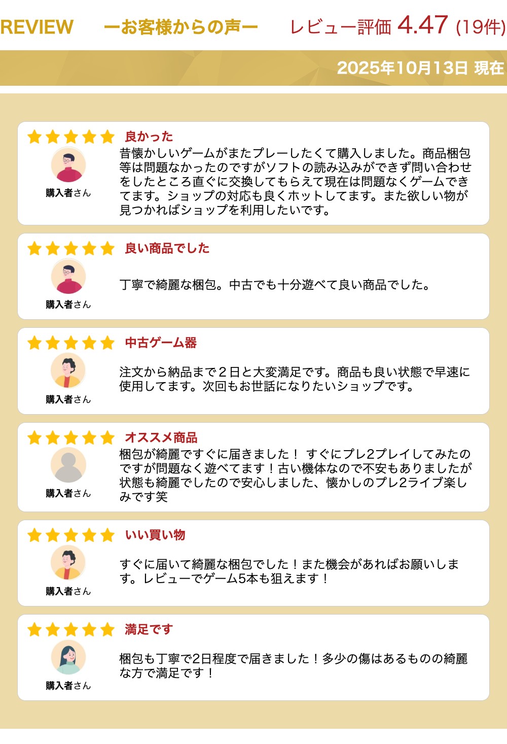 商品情報 商品状態 ★すぐ遊べるセットメモリーカード付★ 【内容物】※画像はイメージです■本体※型番はお選び頂けません。SCPH10000 〜SCPH-39000のいずれかをお送りいたします。■電源ケーブル ■純正コントローラー(カラーランダム) ■AVケーブル■PS2メモリーカード(純正) ※箱・説明書等、記載のない物は付属しておりません 動作確認済み。 綺麗なエアキャップでの包装でお送りします。 当社ではすり替え防止のため商品の写真、シリアルナンバーを控えて管理しております。★★レビュー投稿キャンペーン実施中★★商品レビュー、ショップレビューをしていただいた方全員にPS,PS2ソフト5本漏れなくプレゼント!!※ケース無しの裸ソフトとなります。ご了承くださいませ。 応募方法を確認 商品の説明(新品の場合) 主な仕様 関連商品PS2 本体 【すぐ遊べるセット】PlayStation 2 プレイス...PS2 本体 【すぐ遊べるセット】★純正コントローラー★ PlaySt...PS2 本体 【すぐ遊べるセット】★ メモリーカード2種付 ★ PS2...8,500円8,500円10,980円PS2 本体 ☆HDMI変換 ( 高画質・高音質化 ) ☆すぐ遊べるセ...PS2 本体 【すぐ遊べるセット】★純正コントローラー2個付★ PS2...PS2 本体【すぐ遊べるセット】☆コントローラー2個付☆ PlaySt...11,980円11,500円11,500円PS2 本体 【すぐ遊べるセット】★純正コントローラー★PS2 Pla...PS2 薄型 本体 【すぐ遊べるセット】選べるカラー[ブラック/シルバ...PS2 薄型 本体 【すぐ遊べるセット】 ★ 純正コントローラー ★ ...10,980円10,980円11,980円PS2 薄型 本体 ☆HDMI変換 ( 高画質・高音質化 ) ☆【すぐ...PS2 薄型 本体 【すぐ遊べるセット】☆ 90000シリーズ ☆ 選...PS2 薄型 本体 【すぐ遊べるセット】☆コントローラー2個☆ 選べる...13,980円14,500円14,980円