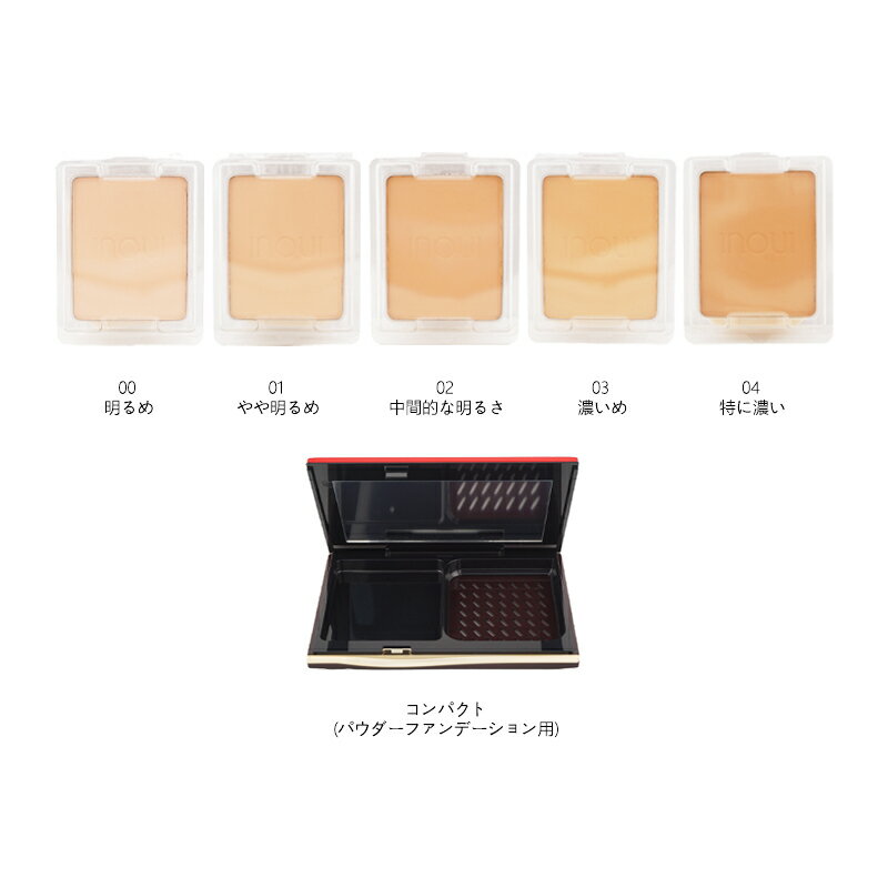 JAN 4909978167387 00 明るめ JAN 4909978167394 01 やや明るめ JAN 4909978167400 02 中間的な明るさ JAN 4909978167837 03 濃いめ JAN 4909978167844 04 特に濃い JAN 4909978167868 コンパクトケース 【商品説明】 軽やかに肌になじみ、均一で自然なつや肌をつくる。 うるおいのあるしっとりなめらかな感触。色むらやくすみを飛ばし、毛穴・小じわの影も目立たせない。 つけたての美しい仕上がりが持続します ・受ける光を自分の肌で吸収発光&反射コントロール。骨格、色、質感を際立たせる、インウイ独自のヒューマン&光コントゥアリング技術 ・肌をケアする成分配合 ・8時間 化粧もち *キメの目立ち・毛穴の目立ち・皮脂くずれ・脂うき・粉うき・粉よれ・薄れ・くすみがなく、つやのある仕上がりが長時間持続 *データ取得済み ・自信に満ち凛とした佇まいを表現したフローラルフルーティシプレの香り ・ノンコメドジェニックテスト・アレルギーテスト済み 【注意事項】 ※ご使用のパソコン、スマートフォンのモニター環境により、カラーが実物と若干異なる場合がありますので、ご了承ください。 ※お肌に異常が生じていないかよく注意してご使用ください。 ※傷、はれもの、しっしん、かぶれ、ただれなどの症状があるときにはお使いにならないでください。 ※高温の場所、直射日光のあたる場所には保管しないで下さい。 ※乳幼児の手の届かないところに保管して下さい。 ※成分表記は、商品の改良や表示方法などの変更により、実際の成分と一部異なる場合があります。 ※商品パッケージに記載の注意事項をご確認の上ご使用ください。 ※商品画像はイメージです。実際のものとは若干異なる場合がございます。 広告文責 楽天DAIKISHOP 0528801706 メーカー 株式会社 資生堂 区分 日本製 *化粧品