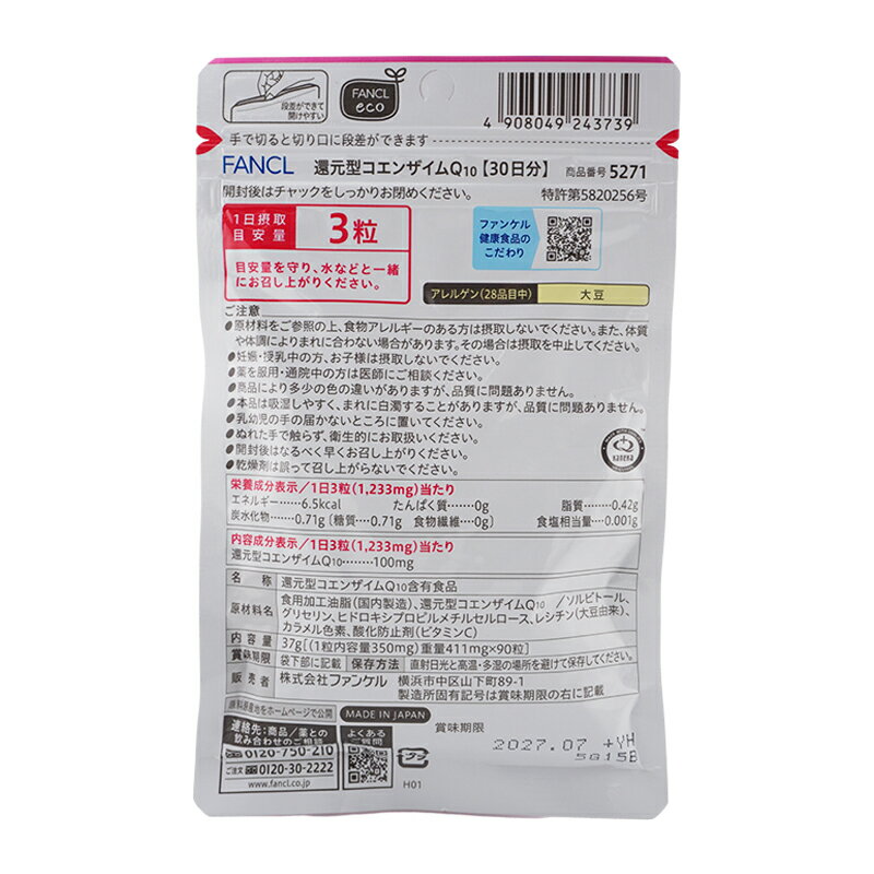 JAN 4908049243739 【商品説明】 ダイレクトに働く還元型のコエンザイムQ10を100mg配合。 さらにファンケル独自の「微細乳化製法」で吸収性を150%アップ。 中高年の方や、運動量が多くエネルギー消費が激しい方、若々しさを保ちたい方、元気に年齢を重ねたい方におすすめです。 【1日の目安】 3粒 【主要成分/1日3粒当たり】 還元型コエンザイムQ10:100mg 【アレルゲン(28品目中)】 大豆 【ご注意】 ※妊娠・授乳中の方、お子様はお召し上がりにならないでください。 【注意事項】 ※ご使用のパソコン、スマートフォンのモニター環境により、カラーが実物と若干異なる場合がありますので、ご了承ください。 ※お肌に異常が生じていないかよく注意してご使用ください。 ※傷、はれもの、しっしん、かぶれ、ただれなどの症状があるときにはお使いにならないでください。 ※高温の場所、直射日光のあたる場所には保管しないで下さい。 ※乳幼児の手の届かないところに保管して下さい。 ※成分表記は、商品の改良や表示方法などの変更により、実際の成分と一部異なる場合があります。 ※商品パッケージに記載の注意事項をご確認の上ご使用ください。 ※商品画像はイメージです。実際のものとは若干異なる場合がございます。 広告文責 ダイキ楽天市場店 0528801706 メーカー 株式会社ファンケル 区分 日本製 *健康食品