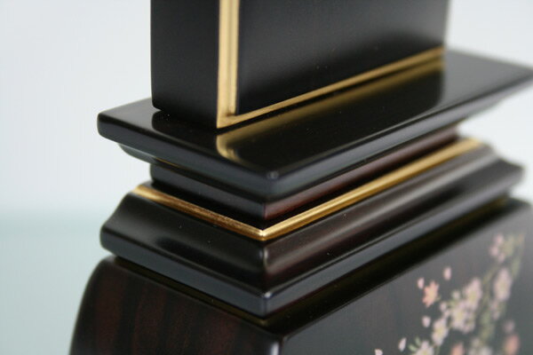 【商品データー】 ●材質:黒檀 ●加飾:本金粉 ●文字入れ:機械彫り・機械書き ●お届け予定日: 原稿確定後より10日前後 (休日を除く) *佐川急便翌日配達地域の場合です。 地域により異なります。 【サイズ一覧】 ●各サイズの商品ページはこちらからご覧いただけます 札丈 寸法 (高×幅×奥) mm 3.0寸 153 × 63 × 42 3.5寸 170 × 68 × 44 4.0寸 190 × 72 × 45 ◆お願い◆ ご注文後、メールにて原稿のご確認をお願いしております。 当店からのメールをお受け取りいただける状態にしていただき、ご返信をお願い致します。 ご返信を頂いた後に彫りの手配をいたしますので、 お急ぎの方はご注意下さい。 当該商品は自社販売と在庫を共有しているため、在庫更新のタイミングにより、 在庫切れの場合やむをえずキャンセルさせていただく可能性があります。 メーカーの生産の都合によりデザイン、色調、柄などが予告なしに変更される場合がございます。 また、生産時期、生産ライン、入荷時により同色でも色合いが違う場合がございます。蒔絵位牌「優桜/黒檀:4.0寸」 ★美しい桜の蒔絵が入った高品質なお位牌★ ■こだわりの品質■「黒檀」と「蒔絵」の高級位牌 黒地に美しい木目が浮き出た最高級の「縞黒檀」を使用し、その木目を生かしたお位牌です。極めて硬く耐久性に優れ、虫や菌に侵食されにくいという特徴もあります。多年に渡って安置される故人様の霊位の形をあらわすのにふさわしい逸品の高級位牌です。 ■金沢産金粉を使用■経験豊かな職人集団によりISOfに基づいた国内唯一の一貫生産体制を確立した工場で生産されております。多年に渡りご供養頂く大切なお位牌に永遠の不変性を損なわない美しい光沢を持つ金沢の「五毛色金粉(純度98.91%)」を使用しております。 文字彫り(文字書き)無料サービスでさらに送料も無料でお届けいたします。 文字入れ見本はこちら 書体の見本はこちら 文字変換の出来ない文字などがある場合はFAXでお送りいただければ間違いがないかと思います。 【商品詳細】 材質 黒檀 加飾 本金粉 文字入れ 機械彫り・機械書き お届け予定日 原稿確定後より10日前後(休日を除く) *佐川急便翌日配達地域の場合です。地域により異なります。 【サイズ】 札丈 4.0寸 寸法 総高:190mm × 総巾:72mm × 総奥行:45mm