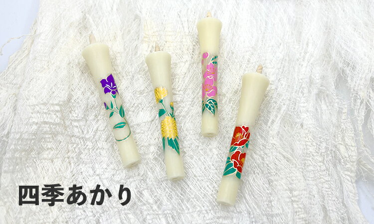 その他のロウソクはこちら その他ご進物はこちら ろうそく 和ろうそく 絵ろうそく 高澤ろうそく 桜 椿 菊 桔梗 季節 四季 花 蠟燭 ロウソク 白蝋 櫨 植物成分 植物性 枯れない花 御供 お供え 進物 進物用品 日常使い 日本製 made in japan 伝統工芸品 伝統 石川県 能登半島 七尾市 手作業 型流し製法 ●シリーズ:四季あかり ●形:イカリ型2号 ●寸法:9cm(上径1.7cm × 下径1cm) ●燃焼時間:約55分 ●本数:各8本 アソートタイプのみ (桜/椿/菊/桔梗:各2本) ●箱サイズ:縦19.8cm/横8.9cm/高2.5cm ●ブランド:高澤ろうそく ●生産国:日本(石川県) / made in japan 注意事項 当該商品は自社販売と在庫を共有しているため、在庫更新のタイミングにより、在庫切れの場合やむをえずキャンセルさせていただく可能性があります。 子児の手の届かない所に保管してください。 直射日光を避け、涼しい所に保管してください。(曲がりや変質の原因になります。) 仕様に際して、必要事項などが記載してありますのでご確認ください。 包装に関しましては、個別包装のみとなっております。 クリックポスト配送の場合、破損等の保証は出来ない為その旨ご了承頂けた上でご注文願います。進物でのご注文に限り、箱型の専用BOXに入れての配送としております。アソート:桔梗/桜/菊/椿 各2本 桜:清く美しいあかり 計8本 椿:気取らない優雅なあかり 計8本 菊:おぼろげな思い出のあかり 計8本 桔梗:変わらぬ愛誠実のあかり 計8本 サイズ詳細 進物用品の場合 お客様の声 総レビュー6,400件突破!皆さまのリアルな声をご紹介! たくさんの高評価ありがとうございます。 和ろうそくについて 商品詳細 シリーズ 四季あかり 形 イカリ型2号 寸法 9cm (上径1.7cm × 下径1cm) 燃焼時間 約55分 本数 各8本アソートタイプのみ(桜/椿/菊/桔梗:各2本) 箱サイズ 縦19.8cm/横8.9cm/高2.5cm ブランド 高澤ろうそく 生産国 日本(石川県) / made in japan 注意事項 当該商品は自社販売と在庫を共有しているため、在庫更新のタイミングにより、在庫切れの場合やむをえずキャンセルさせていただく可能性があります。 子児の手の届かない所に保管してください。 直射日光を避け、涼しい所に保管してください。(曲がりや変質の原因になります。) 仕様に際して、必要事項などが記載してありますのでご確認ください。 包装に関しましては、個別包装のみとなっております。 クリックポスト配送の場合、破損等の保証は出来ない為その旨ご了承頂けた上でご注文願います。進物でのご注文に限り、箱型の専用BOXに入れての配送としております。