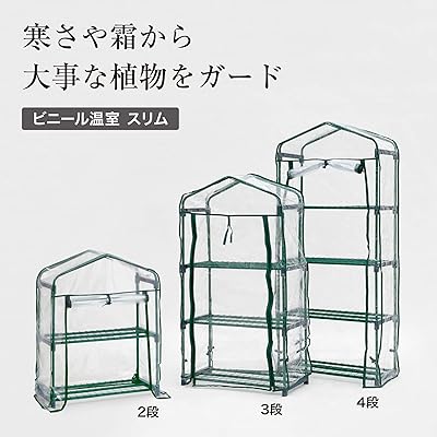 ビニールハウス ビニール温室 スリム 3段 グリーン 園芸 防寒カバー 植物 育苗 使いやすい簡易温室 ベランダ 狭小スペース 簡単組立 ファスナー付き スチール 樹脂 ASH-19Tブランド色クリア (clear)モデルASH-19T商品説明【商品概要】工具いらずで組立簡単。パーツを差し込んでビニールをかぶせるだけ。寒さや霜から大切な植物を守る。 シンプルで、使いやすい簡易温室。奥行き約32cmのスリムタイプで、ベランダや狭小スペースに。このビニール温室は、ビニールを全てとりはらって使用できるため、夏の暑い日でもビニールをはずすことができます。ファスナーで開閉。巻き上げれば出し入れもラクラク。ジッパーを開けてネットを上に巻き上げていくと、内側と外側のヒモで挟めるようになり、そのままヒモでくくればネットを開けた状態で固定可能。作業をするときのジャマにならない。ラックの脚元には、ビニールを固定できるヒモが4か所についているので、風が吹いてもビニールが飛んでいってしまう心配はなし。サイズ:約幅69cm×奥行32cm×高さ123cm重量:約2.6kg材質:(本体)スチール、(カバー)塩化ビニル樹脂、(ジョイント)ポリプロピレンカラー:(パイプ、ジョイント)グリーン、(ビニール)クリア棚板サイズ:約幅62cm×奥行27cm棚板1枚あたりの耐荷重:10kgまで(この値は実測値です。値ではありません。)【商品説明】【商品詳細】商品種別:ビニールハウス・温室用品商品名:ビニールハウス ビニール温室 スリム 3段 グリーン 園芸 防寒カバー 植物 育苗 使いやすい簡易温室 ベランダ 狭小スペース 簡単組立 ファスナー付き スチール 樹脂 ASH-19T製造元:商品番号:ASH-19T商品内容:2) 3段色:クリア (clear)商品タイプ:1) 本体【当店からの連絡】