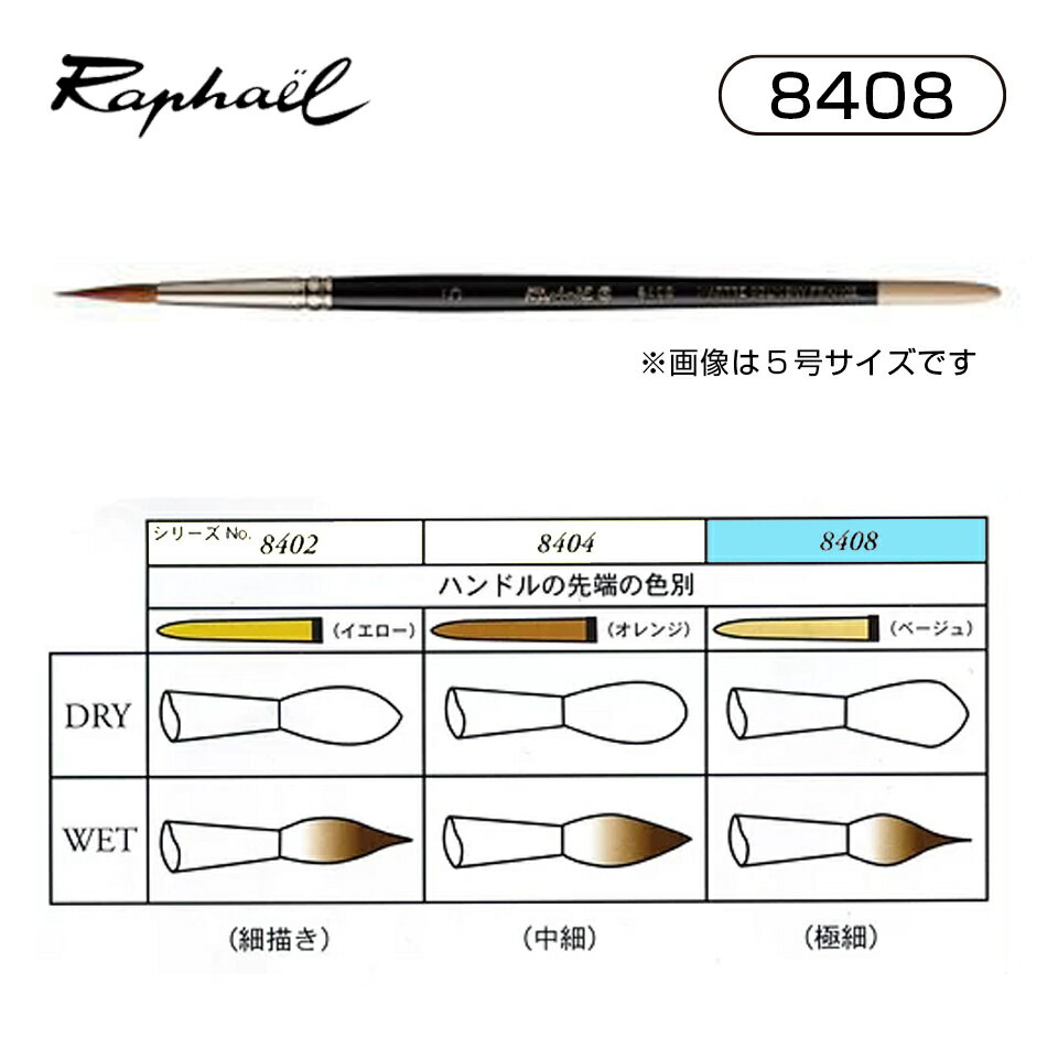 ラファエル 水彩筆 8408 3/0号 2/0号 0号 1号 2号 3号 4号 5号 6号 7号 8号 10号 12号 コリンスキー 丸 ラウンド 極細 短軸 Raphael 画材 水彩 老舗の筆専門メーカー「ラファエル」 ■3/0号・全長…172mm・穂の長さ…6mm・穂の太さ(直径)…1.7mm■2/0号・全長…172mm・穂の長さ…8mm・穂の太さ(直径)…2mm■0号・全長…177mm・穂の長さ…10mm・穂の太さ(直径)…2.2mm■1号・全長…179mm・穂の長さ…12mm・穂の太さ(直径)…2.5mm■2号・全長…183mm・穂の長さ…14mm・穂の太さ(直径)…3mm■3号・全長…187mm・穂の長さ…16mm・穂の太さ(直径)…3.5mm■4号・全長…190mm・穂の長さ…18mm・穂の太さ(直径)…4mm■5号・全長…191mm・穂の長さ…20mm・穂の太さ(直径)…4.5mm■6号・全長…200mm・穂の長さ…22mm・穂の太さ(直径)…5mm■7号・全長…198mm・穂の長さ…24mm・穂の太さ(直径)…5.5mm■8号・全長…202mm・穂の長さ…26mm・穂の太さ(直径)…6mm■10号・全長…228mm・穂の長さ…29.5mm・穂の太さ(直径)…7mm■12号・全長…233mm・穂の長さ…32.5mm・穂の太さ(直径)…8mm※写真は実寸ではありません。※商品画像は見本です。お届けの商品は、ご注文のサイズの筆になります。【商品情報】・型:ラウンド(丸、極細)・毛質:コリンスキー・軸仕様:黒&ベージュ・短軸敏速で正確な作業が可能な水彩筆。反応が良いため穂先で特に細密な線描効果が得られます。穂先が細く、揃いが良い為、シリーズ8404同様人気のある水彩筆。一本一本職人が最終検品をした証のSマーク付き。当店では、実店舗と在庫を共有しております。定期的に更新しておりますが、ご注文のタイミングによっては在庫切れの場合がございます。ご了承くださいませ。品切れの場合はメーカーよりお取り寄せをさせていただきます。在庫状況・納期をメールにてお知らせいたしますが、入荷までお待ちいただけない場合は、キャンセルを承ることも可能でございます。 2