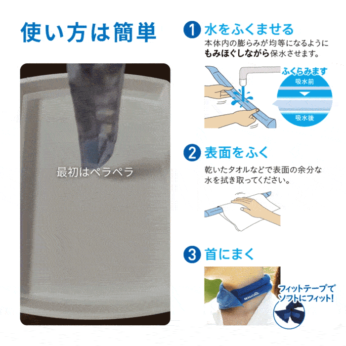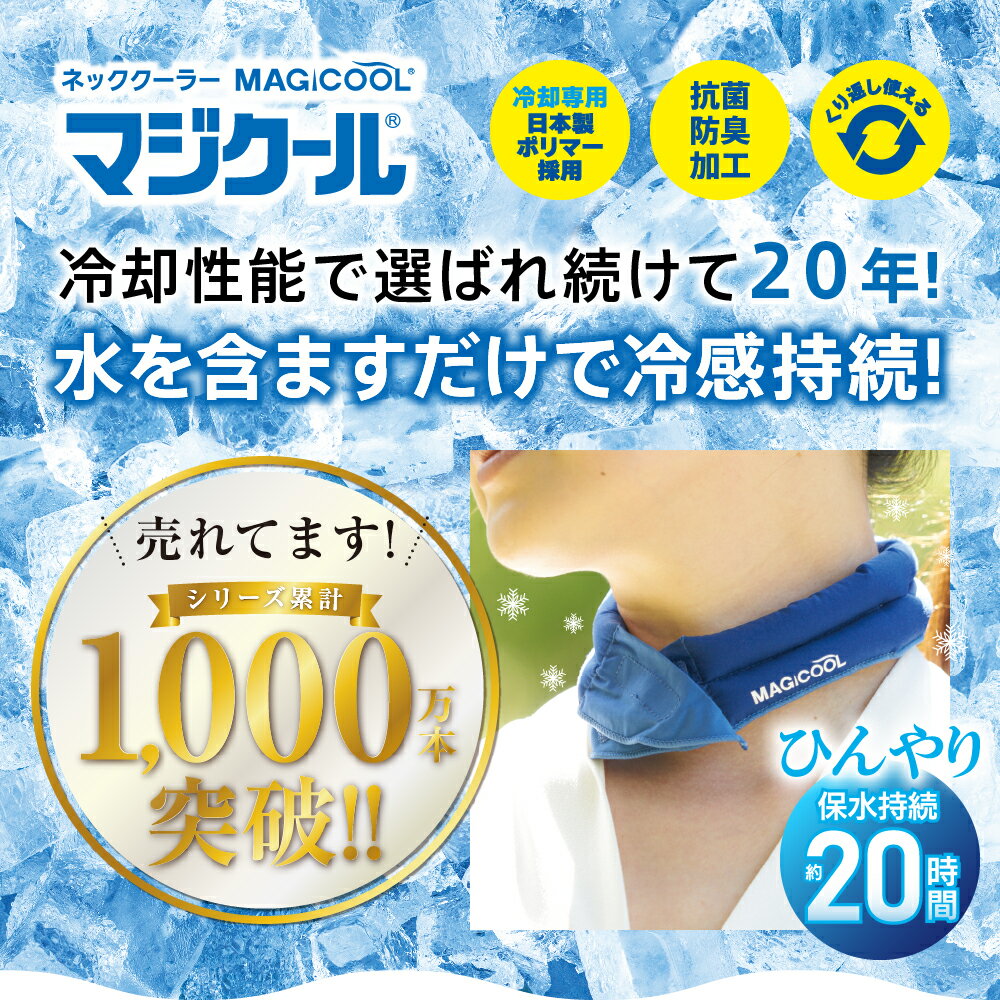 選ばれ続けて20年!!累計販売数1,000万本突破!! ネッククーラーのパイオニアである「マジクール」は2005年の発売以来、累計1,000万本以上の販売実績を誇り、多くのお客様に愛されてきました。 数々の類似品(中には粗悪品と呼ばざるを得ない品質の物)が出回る中、お客様のご指摘・要望に耳を傾けて常に改良を重ね、お客様の求める品質を追究し続けてきました。その結果、ネッククーラー及び冷感製品のトップブランドを維持し続けています。 製品仕様 製品名 マジクール(M ふつうサイズ) 材質 ・生地…綿100% ・内容物…特殊吸水ポリマー ・面ファスナー…ナイロン100% サイズ 約(縦)4.8cm×(横)53cm 品番 ネイビー…DNIMC2M-NB ライトブルー…DNIMC2M-LB ドットブルー…MCFT6-DBR ドットグレー…MCFT6-DGR JAN ネイビー…4529214017353 ライトブルー…4529214017360 ドットブルー…4529214015595 ドットグレー…4529214015601 製造国 韓国