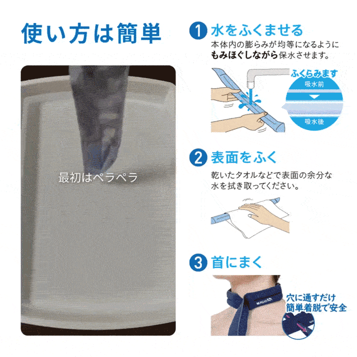 選ばれ続けて20年!!累計販売数1,000万本突破!! ネッククーラーのパイオニアである「マジクール」は2005年の発売以来、累計1,000万本以上の販売実績を誇り、多くのお客様に愛されてきました。 数々の類似品(中には粗悪品と呼ばざるを得ない品質の物)が出回る中、お客様のご指摘・要望に耳を傾けて常に改良を重ね、お客様の求める品質を追究し続けてきました。その結果、ネッククーラー及び冷感製品のトップブランドを維持し続けています。 製品仕様 製品名 マジクール スカーフ 材質 ・生地…綿100% ・内容物…特殊吸水ポリマー サイズ 約(縦)5cm×(横)96cm 品番 ネイビー…DNIMC2F-NB ライトブルー…DNIMC5LB ピンク…DNIMC4PK ドットブルー…DNIMC5DB ドットグレー…DNIMC5DG JAN 4529214017315(ネイビー) 4529214015274(ライトブルー) 4529214013553(ピンク) 4529214015328(ドットブルー) 4529214015687(ドットグレー) 製造国 韓国