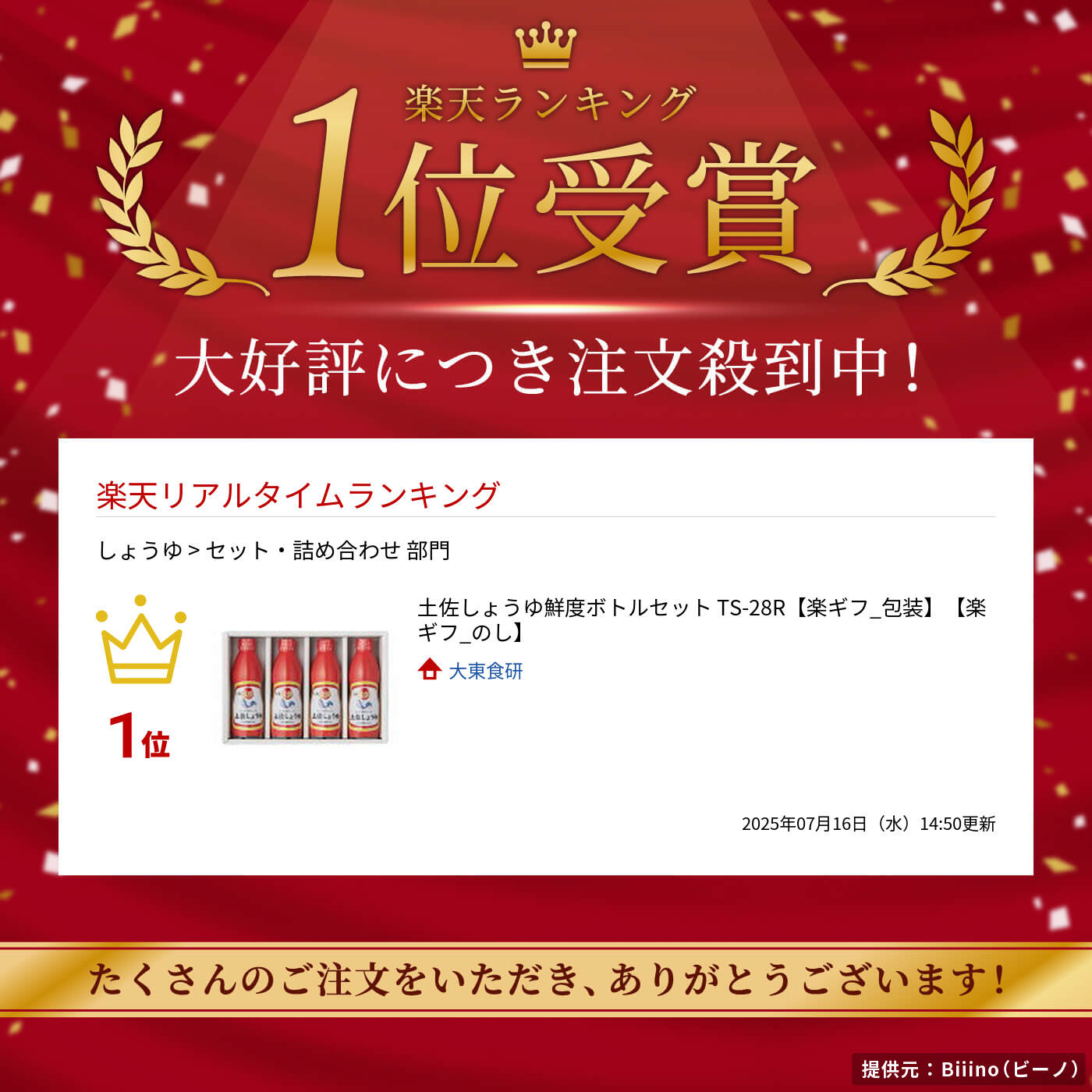 ギフト対応 ご注文の前にご確認ください ●梱包について 複数個同じ送り先でご注文いただいた場合、当店ではなるべく個数が少なくなるようまとめさせていただいております。 製品名 土佐しょうゆ 名称 しょうゆ加工品 内容量 450ml×4本 賞味期限 1年 保存方法 直射日光を避け、常温で保存してください。 原材料名 しょうゆ(大豆・小麦を含む)(国内製造)、食塩、発酵調味料、醸造酢、砂糖、かつおぶしエキス(大豆を含む)、かつおぶし/酒精、調味料(アミノ酸等) アレルゲン物質 小麦、大豆料理人が受け継いできた伝承の味を二重構造の鮮度ボトルに詰めました。二重構造で空気に触れないため土佐しょうゆの色とまろやかな味は変わらず、鰹節の香りを閉じ込め、いつでも味わい豊かに最後までおいしくお召し上がりいただけます。内容:土佐しょうゆ鮮度ボトル450ml×4本入り