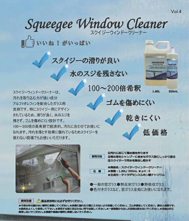 【窓ガラス用洗剤】 汚れを取り込む力が強いアルファオレフィンを主成分とするガラス用洗剤です。 水の筋を残さず汚れを落とし、ガラスの輝きを取り戻すよう化学的にデザされた製品です。 スクイジーの滑りがよいため作業性が高く、また50〜200倍と高希釈での使用が可能なため、経済的にも優れています。 スクイジーを使用しない現場でもお使いいただけます。 【特徴】 ●スクイジーの滑りがよい ●汚れ落ちがよく拭き筋を残さない ●ゴムを傷めにくい ●乾きにくい ●100〜200倍希釈で経済的 ●低価格 【製品データ】 商品名:スクイジーウィンドークリーナー 容量:1.89L 標準希釈倍率:50〜200倍 pH:約9(25℃) 成分:スルホン酸ナトリウム、アルファオレイン