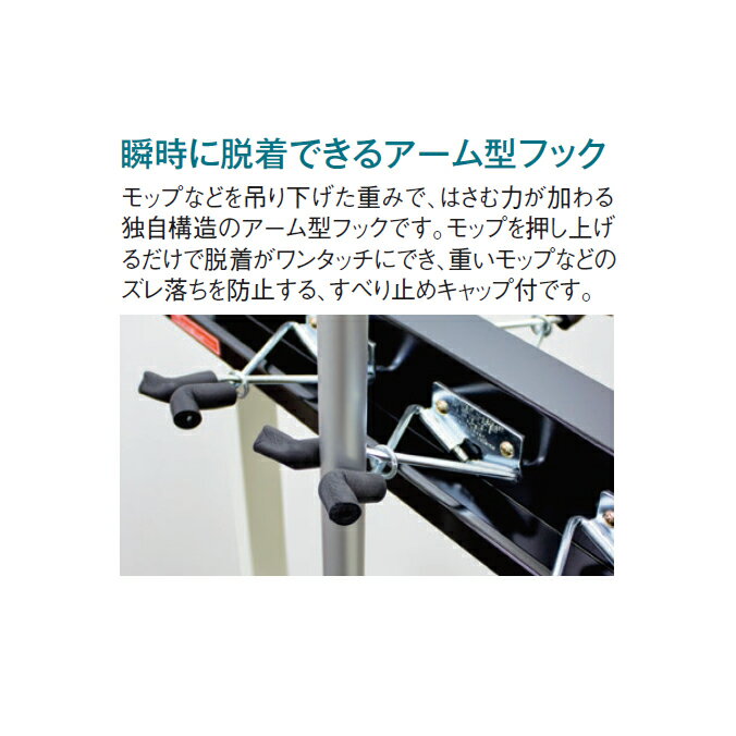 モップハンガーRC型 モップなどを簡単に脱着できるアーム型フックのタフなハンガー。 多彩な場所で活躍する様々なタイプをご用意。 ・瞬時に脱着できるアーム型フック モップなどを吊り下げた重みで、はさむ力が加わる独自構造のアーム型フックです。 モップを押し上げるだけで脱着がワンタッチにでき、重いモップなどのズレ落ちを防止する、すべり止めキャップ付です。 ・モップの吊り下げ方・取り外し方 吊り下げは、モップを下から上に軽く押し上げればセット完了です。 取り外しは、モップを上に押し上げて引けば簡単に外れます。 【大型収納タイプ】 モップハンガーRC型(12本掛) 材質:本体・受皿:スチールに粉体塗装、丸パイプ:スチールにユニクロメッキ サイズ:本体:約W930×D505×H1375mm、受皿:約W845×D345×H27mm(内寸) キャスター直径:50mm 重量:約11.5kg ●お客様組立商品 ●キャスター付 ●フック用黒ゴムは交換用(上記)があります。 【省スペースタイプ】 モップハンガーRC型コンパクト(6本掛) 約50cm角の省スペースに最大13品目の清掃用品が収納可能。 材質:本体・受皿:スチールに粉体塗装、丸パイプ:スチールにユニクロメッキ サイズ:本体:本体:約W536×D505×H1375mm、受皿:約W453×D345×H27mm(内寸) キャスター直径:50mm 重量:約9kg ●お客様組立商品 ●キャスター付 ●フック用黒ゴムは交換用(上記)があります。 合計金額で送料無料の場合や送料無料の商品でも配送先が沖縄、北海道の場合は別途送料が必要になります。ご注文時に送料が無料になっている場合がありますが、後ほど送料を修正し正式な金額をご連絡いたします。 ※注意点 モニターの発色によりお色が違って見える場合がございます。