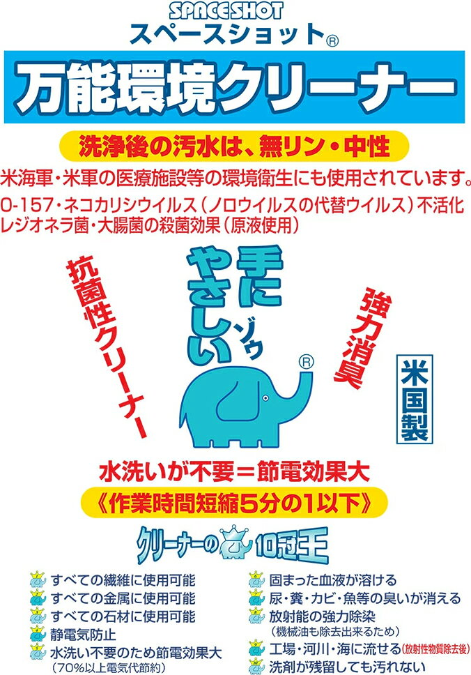 スペースショット万能環境クリーナー すべての石材・繊維・金属・ガラス・塗装面・白木に使用できます。 製品データ 容量:500ml、1L、4L、18L 標準希釈倍率:原液〜50倍 pH:10.7