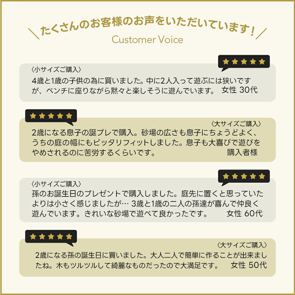 ☆☆こんな方にオススメ☆☆ 普段忙しくて、子供を公園に連れていけない方 不審者対策でご自宅で遊ばせたい方 庭スペースを子供のために利用したいとお考えの方 商品名 木製砂場 蓋付き 大サイズ118×100cm/小サイズ100×80cm 本体サイズ 【大サイズ】約幅118×奥行100×高さ24cm / 背もたれ使用時高さ 39.5cm 【小サイズ】約幅100×奥行80×高さ24cm / 背もたれ使用時高さ 39.5cm 内寸サイズ 【大サイズ】約幅115×奥行93×高さ20cm 【小サイズ】約幅97×奥行73×高さ20cm 重量 【大サイズ】約14.5kg 【小サイズ】約11.5kg 砂の目安 【大サイズ】約95kg 【小サイズ】約65kg (あくまで目安になります。砂の種類等によっても変化します) 原産国 中国 ご注意 ※こちらの商品には、砂は含まれておりません。 ※木枠のみで、底板は付属しておりません。 配送エリア 配送エリア:全国 ※ただし、北海道・沖縄や離島は別途料金が必要です。 配送エリアについては事前にお問合せ願います。 お届け状態:段ボール箱