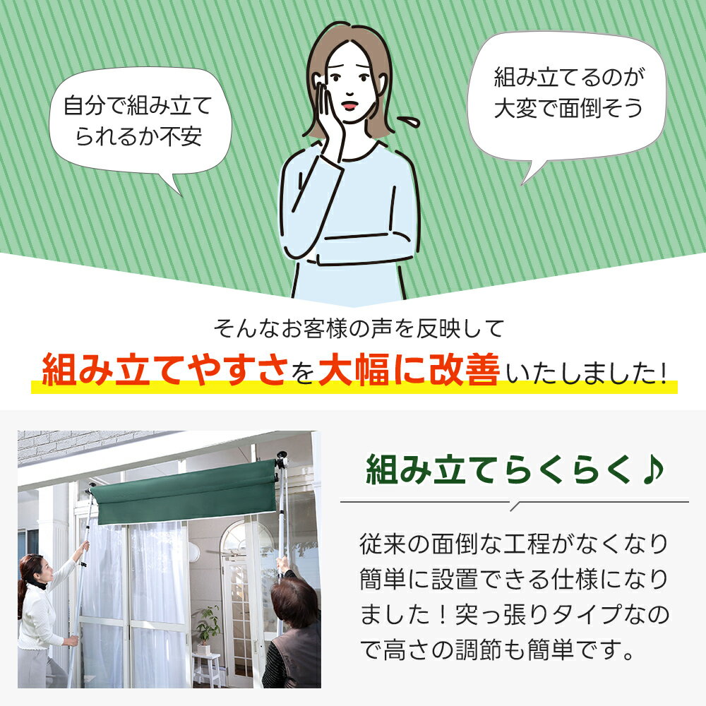 組立ラクラクオーニング ダークグリーン ブラウン 幅200cmタイプ つっぱり式 前幕付き 物干竿フック付き 日よけ 日除け サンシェード 目隠し UVカット 節電 洗濯 スクリーン ブラインド 屋外 窓 バルコニー テラス 庭 紫外線 熱中症対策