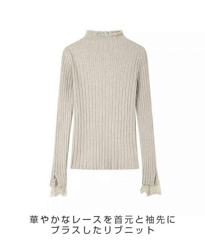 【期間限定:3,490円→2,399円!】 トップス ニット リブニット レディース 秋冬 冬 長袖 袖レース ハイネック 重ね着風 レース フレア袖 レースニット フリルネック 【重ね着風レースドッキングリブニット】 ダークエンジェル