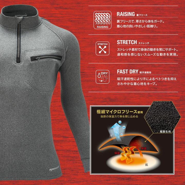 【5%OFFクーポン配布★11/25-26】防寒 冬用インナーシャツ 長袖シャツ 67615 蓄熱ジップアップ インナー ストレッチ 裏フリース 吸汗速乾 裏起毛 秋冬 作業服 作業着 アタックベース