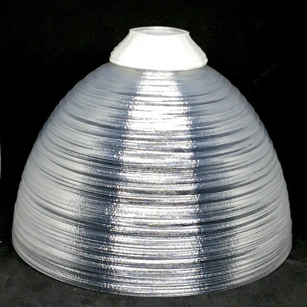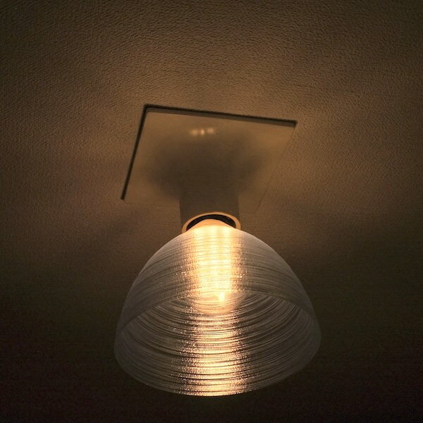 廊下やトイレなどの裸電球を透明な電球カバー「3Dデザインシェード」でかざってみませんか? この巻糸模様つきの電球カバーは,普通の LED 電球にかんたんに取り付けられて,まぶしさがおさえられ,ひとあじ違う輝きがえられます.電球を LED フィラメント電球に変えれば,もっと きらきらと きらめきます.(上の写真をご覧ください.) 天井に魅力的な影ができます.また,ランプシェードが壊れたときに,そのかわりとして使うこともできます.ただし白熱電球には使用できません. ランプシェードは透明なプラスティック (PLA=ポリ乳酸) をつかって 3Dプリンタでつくっています.生分解性プラスティック PLA 製なので,いろいろつけかえてためしても環境負荷はちいさくてすみます.キャップ (根本の部分) は熱に強いプラスティック (ABS) でつくっていて,その色は上のオプションによって白と黒から選択できます. また,口金 E26 の電球に適合するものと E17 に適合するものを上のオプションによって選択できます. つぎの写真は口金 E26 の白と黒のキャップです.(いずれの場合も電球カバー本体は透明です). 口金 E17 の場合は 2 種類のキャップが付属しますので,適しているほうを使ってください. もちろん色は黒も指定できます. ソケットが細くて取り付け位置がやや深い場合など,器具や電球によっては電球にこのカバーをつけると すきまがなくなって点灯しなくなる場合があります. 下の写真のように取り付け位置がやや深いソケットのなかでも,左のソケットは太いので問題ありませんが, 右のソケットは細いので点灯しないことがあります (電球をつけた写真では,すきまがほとんどないことがわかります). 電球に関しても,口金にちかい部分が太い電球 (たとえば OHM LDA5L-H R21 という人感センサーつき電球) にとりつけると点灯しなくなることがあります. 点灯しなかったときなどはメールやお問い合わせフォームなどでご相談ください. キャップを加工することで点灯させることができる場合もありますが,加工がむずかしい場合などは交換・返金などで対応させていただきます. ご注意: このカバーは LED 電球専用です. ◆60℃ をこえる温度では透明な部分が変形する可能性がありますので,熱い環境や白熱電球には使用できません. 白熱電球に使用すると最悪,溶けたり炭化したり (黒くなったり) することがあります. LED 電球でも発熱がとくに多かったり,熱がたまりやすい環境では変形する可能性がありますのでご注意ください. 白熱電球 60 W 相当以下の LED 電球で問題がおこることはまれですが,フィラメント電球以外の白熱電球 100 W 相当以上の LED 電球には使用しないことをおすすめします. それでも,LED 電球に使用するかぎりは発火する温度にはなりません. ◆ソケットの深い位置に電球を取り付ける器具や電球との間にすきまがない器具には使用できません. 点灯しなかったり,点灯しても熱がたまりやすかったりするためです. ◆屋外など,太陽光が直接あたる場所で使用するとプラスティックが劣化します. 場合によっては 1 年以下しか使用できないことがありますので,ご注意ください. ◆ボールランプには使用できません. ◆シェードには重力以外の力がかからないようにして使用・保存してください. 横から押された状態や平らでない場所で保存するなどすると,シェードが変形して,もとにもどらなくなります. 【電球カバーの取り付け方法】 この電球カバーを電球にとりつけるには,いったん電球を消してはずし,電球カバーをとりつけてからつけなおします. 他にない商品ですので,メールでの「お問い合わせ」にていねいにおこたえするとともに,アフター・サービスにも万全を期しています. なお,お客様の負担金額をおさえるため基本的に定形外郵便 (メール便) で発送します. 【どうやって作っているの?】 この電球のカバー (シェード) は PLA というプラスティックをつかった 3D 印刷で 1 回らせん状にまきつけてつくっています. 通常の 3D 印刷とはちがう新開発技術です.同様の方法でつくっている地球儀の印刷のようすを YouTube (youtu.be/YWx1vqig2-o) でみることができます. 【サイズ変更などのご希望にも対応】 お問い合わせいただけばサイズ変更などのご希望にも対応します.かんたんな変更であれば数 100 円程度の追加でできます. 【もっと知りたいときは?】 この製品や関連する製品についてもっと知りたいときは「3Dデザインランプ」などのキーワードで ネット検索してみてください.きっと,いろいろな情報がみつかります. 【仕様】 - サイズ: 直径 16 cm の製品の高さは約 12 cm.直径 19 cm の製品の高さは約 14 cm. - 使用可能な電球: LED 電球,口金 E26 (または E17),ボールランプでないもの. 直径 16 cm の製品には直径 10 cm 以下 直径 19 cm の製品には直径 12 cm 以下 の電球を使用してください. . 【保証と交換について】 3D デザインシェードはまれに 5 年以内に製造上の原因で破損することがあります.しかし,このような破損が生じた場合などは製造・販売元であるデイシ