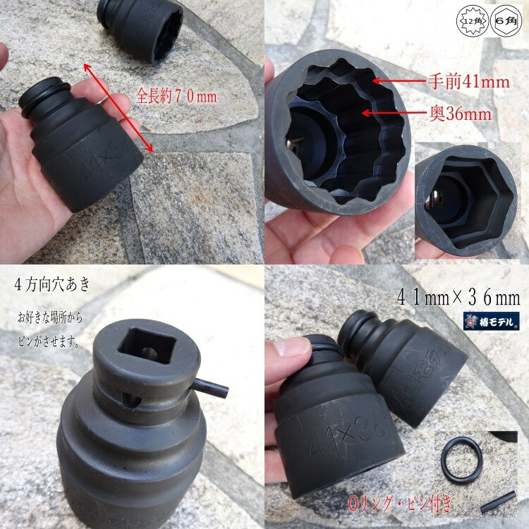 【椿モデル】 椿モデル PWS4136 41mm×36mm仮締用インパクトソケットW ■サイズ ソケットサイズ:41mm×36mm 角数:12角or6角 全長:約70mm ■特徴 ・椿モデルインパクトレンチ仮締め用Wサイズソケット12角・6角。 ・手前と奥で2サイズが使用でき、ソケットの付け替えが不要。 ・表面はパーカー処理により、耐久性の向上。また、メッキのはがれも防止。 ・4つ穴式ピンタイプで、取り付けの際にピンが差し込みやすい。 ※PC環境によって色の差異がありますのでご了承下さい。 ※説明書き、注意書きをよくお読みになりご使用ください。 椿ダブルソケット36mm×32mmはこちら 椿ダブルソケット32mm×27mmはこちら その他インパクト関連はこちら
