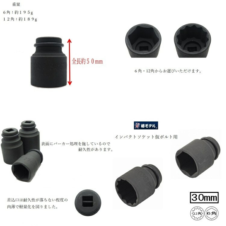 【椿モデル】 椿モデル PS30 インパクトソケット仮ボルト用 ■サイズ ソケットサイズ:30mm 角数:6角or12角 全長:約50mm 差込口:12.7mm(1/2) ■特徴 ・6角、12角よりお選びいただけます。 ・小さくて軽いので、かさばらず持ち運び便利。 ・軽いのでインパクトレンチへの負担も少ない。 ・差込み口は耐久性が落ちない程度の薄肉になっており、薄肉であることで軽量化と持ち運びやすさ、インパクトレンチへの負担の軽減にもなります。 ・表面にパーカー処理を施しているため、耐久性があります。 ※PC環境によって色の差異がありますのでご了承下さい。 ※説明書き、注意書きをよくお読みになりご使用ください。 その他インパクト関連はこちら