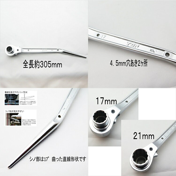 ■トップ工業 TOP RM1721N-BT-SV 総磨きラチェット 鳶仕様 ■機能 ・鳶仕様 ・職人仕上げ総磨き ・本体・ソケット・爪は鍛造成形により、耐久性抜群です ・セーフティコード用のφ4.5穴が2ヶ所あります ・鳶職人さんからの提案による、シノ部は17°曲った直線形状です ・シノ部は番線を巻く際に一定の位置に決めやすい形状になっています ■仕様 全長:約305mm サイズ:17mm×21mm ※PC環境によって色の差異がありますのでご了承下さい。 ※説明書き、注意書きをよくお読みになりご使用ください。 その他ラチェットはこちら