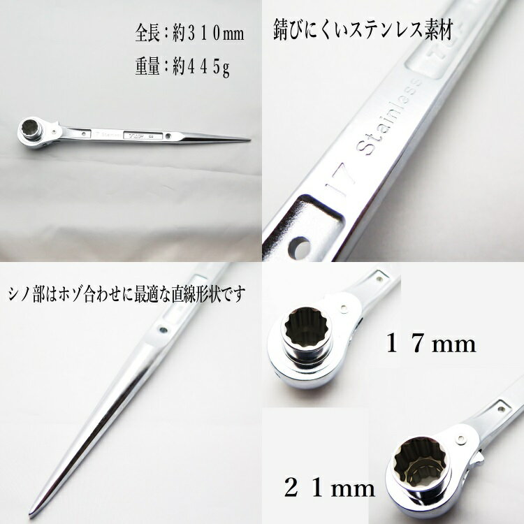 ■トップ工業 TOP SRM-1721 ステンレスラチェット 長直 ■機能 ・長直タイプ ・本体、ソケット、爪、部品オールステンレス製です ・ステンレス鋼に特殊メッキを施し、耐食性に優れています ・塩水噴霧試験連続48時間異常有りません ・本体、ソケット、爪は鍛造成形により、耐久性抜群です ・表面の輝きは職人の手磨きによる高級感漂う逸品です ・セーフティコード用のφ4.5穴が2ヶ所あります ・シノ部はホゾ合わせに最適な直線形状です ■仕様 全長:約310mm 重量:445g サイズ:17mm×21mm ※PC環境によって色の差異がありますのでご了承下さい。 ※説明書き、注意書きをよくお読みになりご使用ください。 その他ラチェットはこちら