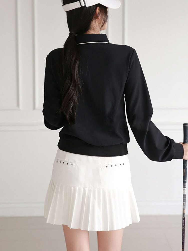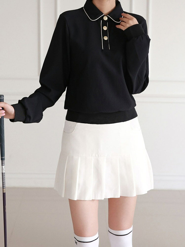 ゴルフウェア レディース 韓国 ポロシャツ 長袖 Tシャツ リブ ストレッチ バイカラー ライン 丸襟 フェミニン 金ボタン エレガント 秋 春 冬 おしゃれ ゴルフ ゴルフウエア ウエア 白 黒 スポーツウェア