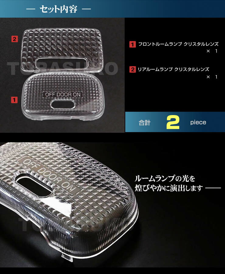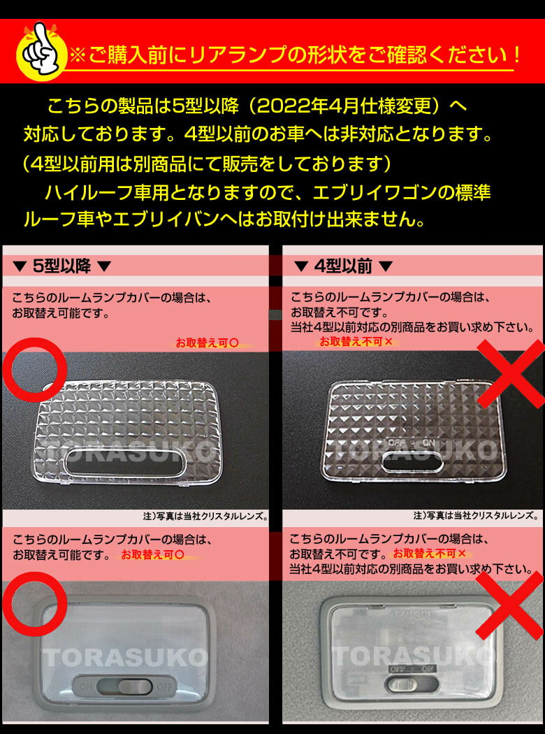 検索用ワード クリスタルレンズ,クリスタルレンズカバー,ルームランプカバー,エブリ ルーム,エブリ led,エブリ パーツ,スズキ エブリイワゴン パーツ,エブリイ ルーム,エブリイ カバー,エヴリイ ルーム,クリスタルレンズ ルーム,エブリイ クリスタル,高輝度,明るい,激光,爆光,新型,LED,超広角,高輝度,エブリ,エヴリ,led,新型 エブリイワゴン,エブリイワゴン da17w,エブリイワゴン パーツ,エブリイワゴン led,エブリィワゴン パーツ,エブリイワゴン ルーム,everywagon led,everywagon room,エヴリイワゴン ルーム,エブリィワゴン,エヴリイワゴン ルームランプ,ハイルーフ,エブリィワゴン da64w,ロールーフ,エブリィワゴン ハイルーフ ルームランプ,エブリィワゴン パーツ da17w,エブリィワゴン DA64W,エブリーワゴン パーツ,通常ルーフ,ノーマルルーフ,エヴリイワゴン led,エブリイワゴン ルームランプ,エブリィワゴン ルーム,エブリィワゴン led,LED,led,SMD,smd,エヴリィワゴン ルーム,エヴリィワゴン led,エブリイ ルーム,エブリイ led,エヴリイ ルーム,エヴリイ led,エブリィ ルーム,エブリィ led,エヴリィ ルーム,エヴリィ led,everywagon,WAGONR,da17,da64,エブリー ルーム,エヴリー ルーム,エブリー led,エヴリー led,ハイブリッド,ハイブリット,ワゴン ハイブリッド,スズキ,suzuki,SUZUKI,系,led ルームランプ,明るい led,30w,ルーメン,エブリー led 17系,64系 ワゴン led ルームランプ,新型エブリイ room,SMD,バルブ,バーナー,アクセサリー,用,系,レビュー,送料無料,宅急便,ルーム,ルームランプ,ルーム,ROOM,room,lamp,ランプ,イルミネーション,ホワイト,白,青,DXR,取付説明書,説明書付,取付説明書付き,ディーアール,評判いい,高評価,ブルー,クールホワイト,cool,LEDライト,発光,適合,交換,車,自動車,配線,取り付け,取付け,カンタン,簡単,カー用品,バイク用品,外装パーツ,内装,内装パーツ,インテリア,ドレスアップ,車内,期間限定,価格特価,適合車種,汎用タイプ,おすすめ,オススメ,クチコミ,セール,SALE,%OFF,激安,評判,評価,格安,アウトレット,半額,12V,dc12v,送料無料,楽天市場,楽天,販売,通販,ランキング,SMD,LED,HighpowerSMD,valve, position lamps, illumination, interior light, white, blue, LED light, exchange, car, automobile, mounting, car supplies, bike supplies, exterior parts, dress up, SMD, car, recommended, SALE,% OFF, discount, cheap, outlet, half price, 12V, Rakuten Ichiba, Rakuten, sales, mail order, ranking 製品仕様 ■適合車種 エブリイワゴン DA17W( ハイルーフ車用 ) ※ご購入前にリアランプの形状をご確認ください。 こちらの製品は5型以降(2022年4月仕様変更後)へ対応しております。 4型以前のお車へは非対応となります。(4型以前用は別商品にて販売しております) ※ハイルーフ車用となりますので、エブリイワゴンの標準ルーフ車やエブリイバンへはお取付けできません。 ■セット内容 フロントルームランプ クリスタルレンズカバー:×1 リアルームランプ クリスタルレンズカバー:×1 合計:2ピース ■商品説明■ <エブリイワゴン クリスタルレンズカバー( ハイルーフ車用 ) 2ピース> お取付は、純正レンズとの交換だけですので簡単に行えます。 クリスタルカット採用で、室内はキラキラに… 別売の専用LEDルームランプと併せてお使いいただくと、輝き、ゴージャス感が更にアップいたします。 カラー : クリアクリスタル ※ルームランプカバーを外す時には、小さめのマイナスドライバーの先端をマスキングテープなどで覆って行いますと カバーにキズがつきにくくなります。 ■注意事項■ ※こちらの製品は5型以降(2022年4月仕様変更後)へ対応しております。 ※4型以前のお車へは非対応となります。(4型以前用は別商品にて販売しております) ※ハイルーフ車用となりますので、エブリイワゴンの標準ルーフ車やエブリイバンへはお取付けできません。 ※不適当、または不充分な保守取り扱いによる場合は、保証対象外となります。 ※輸入商品( 非純正部品 )の為、すれ・小傷等がある場合がございます。 予めご了承ください。 ※改造 / 加工してある場合は、いかなる理由でも交換出来ませんので、予めご了承ください。 ※脱着に係る工賃、車輌の代替部品等費用のご負担は、いかなる場合においても保証できませんのでご了承ください。 お取付けは自己責任にてお願いいたします。