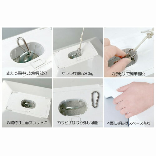 どっしり重い、内部にコンクリートが充填されたウエイトです。 ●20kgの重量があり、どっしり重いコンクリートウエイトです。 ●外装は硬質プラスチック製で見映えも良く、日除けシートや店頭の大型垂れ幕、看板などに最適。 ●内部はコンクリートが充填されており、重心の低い台形で安定感抜群。日除けシートや垂れ幕、グリーンカーテンなどが風であおられてもズレにくく、しっかり支えます。 ●オーニングシート、寒冷紗、よしず、すだれ、店頭の看板、イーゼル、ブルーシートのおもし等に。 ●1個サイズ:幅41.5×奥行32.5×高15.5(cm) ●1個重量:約20kg ●材質:コンクリート(内部)ポリプロピレン樹脂(外装) ●国内製造品 ●3.2mm厚の丈夫な金具を使用し、屋外の風雨に耐える丈夫な設計です。 ●強風時の撤去や店舗での日常的な着脱作業に便利なステンレス製カラビナを付属。 ●底の4面に手が入る手掛けスペースがあるため、移動や位置調整が手軽です。 ●お客様都合による返品不可 ●屋外管理品のため、若干の汚れ、キズ、雨水による濡れなどがございますのでご了承下さい。