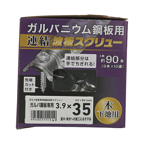 【特徴】高所作業や持ち運びに便利な9連結で作業性に優れています。先端カットで下穴が不要、電動ドライバーでの施工が可能です。【用途】下地が木の場合、ガルバ波板の取り付けに使用します。 【入数】90(9連結が10本)。【材質】傘部:SUS304。ねじ部:鉄(ラスパート)。【サイズ】太さ3.9X長さ35mm。 ご使用上の注意をご使用前に必ずお読みください。イメージ違い、注文間違い等お客様都合と判断される商品の交換、返品は承りかねます。