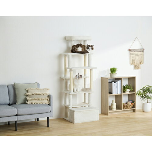 棚板をポール2本以上でしっかり支えることにより、強度をUPしています。大きめの底板で重心が下にあることで、安定を保ちます。収納ボックスには猫砂5Lが2袋入れられます。収納ボックスはふた付きでステップになります。大きさの違う4枚の棚板は、スムーズに上り下りしやすい動線にしています。麻縄を巻いたつめとぎポールは4本あります。最上部はわた入りのふかふかベッドで、高いところが好きな猫ちゃんにぴったりです。ハンモック付きでゆったりくつろげます。ホルムアルデヒドの安全性試験をクリアしています。お客様組み立てとなります。 商品サイズ(約):幅510×奥行600×高さ1575mm。商品重量(約):16050g。耐荷重(約):全体12kg、棚板1枚あたり6kg、ハンモック6kg。ベッドサイズ(約):400×260×60mm。ポールの長さ(約):250mm。つめとぎポールの長さ(約):450mm(麻縄部分:350mm)。棚板サイズ(約):510×350mm、510×190mm、500×255mm、510×305mm(※番号は取扱説明書のパーツリストより)。ハンモックサイズ(約):500×280mm。収納ボックスサイズ(約):500×246×194mm(内寸:476×216×158mm)。 取扱説明書に記載している注意事項をよくお読みになりご使用ください。ご使用になる前に、「安全上の注意」をよくお読みのうえ正しくお使いください。
