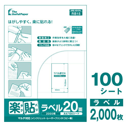 楽貼ラベル 20面(42×74.25mm) 100枚/冊×5冊楽貼ラベルシリーズ RB15(UPRL20A) ラベルをはがしやすい楽貼加工により、作業効率を大幅に改善します