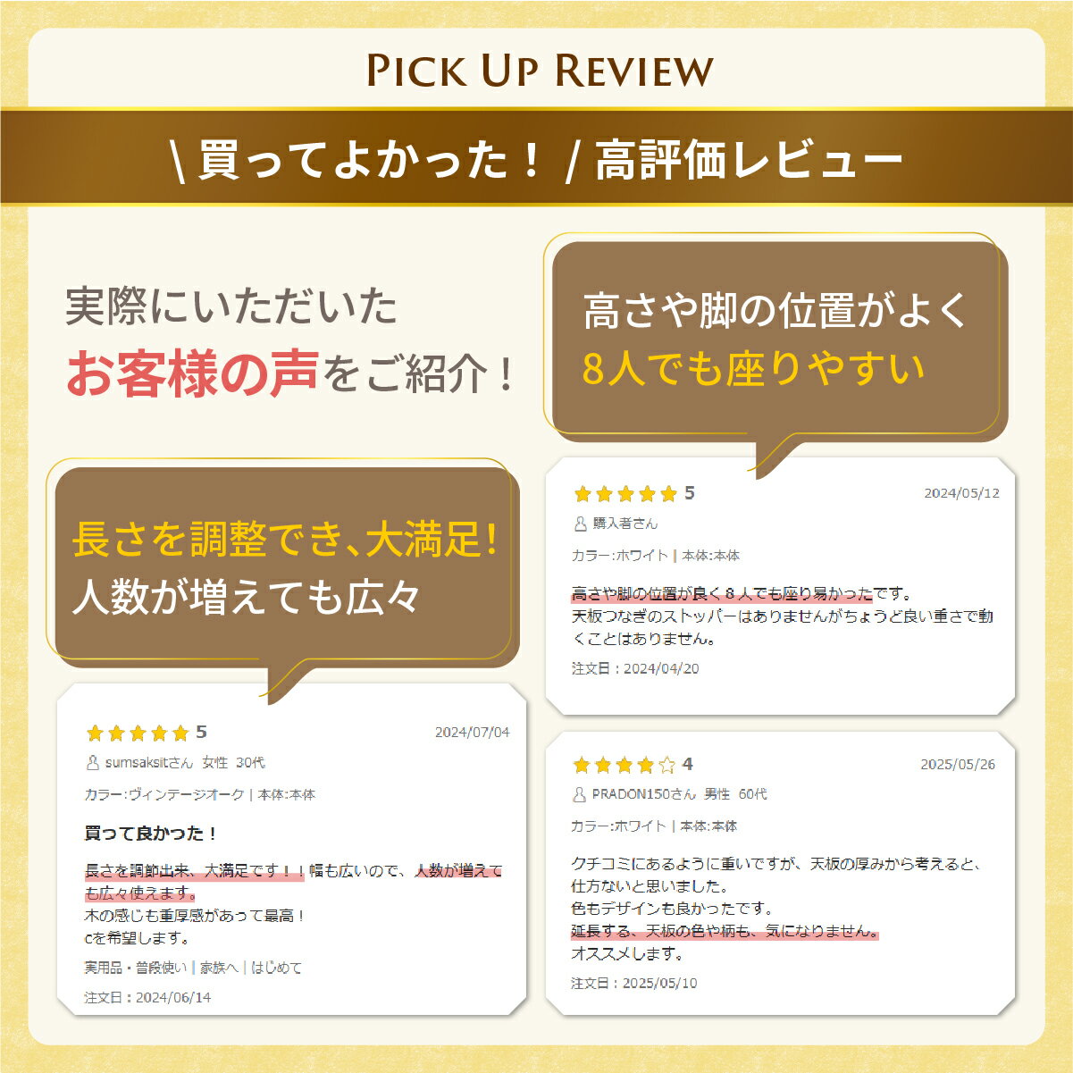 商品のご案内 130-180 cm 幅 伸長式 ローテーブル (WH/VO/SNOW/DK) サイズ 幅 130-180 奥行き 75 高さ 37 cm 重量 46kg 素材 [天板] ホワイトオーク突板[脚] ラバーウッド*ウレタン塗装を施しています カラー WH (ホワイト)VO (ヴィンテージオーク)SNOW (スノー)DK (ダークグレー) 耐荷重 ----- 梱包サイズ 幅 138 奥行き 83 高さ 15 cm (重量) 50kg 備考 組み立て家具 (工具入り) 表示のサイズは商品により多少の誤差を生じることがあります。 掲載されている商品のカラー写真及びカラーサンプルについては、実際の色彩と多少異なる場合があります。あらかじめご了承下さい。 スタッフのおすすめポイント 4人から 6人用に。 伸長式ローテーブル 。生活スタイルや用途に合わせて天板の大きさが変えられます。普段はコンパクトに。来客時はワイドに使用。当テーブルは横幅を4段階に変更でき、幅 130cm, 150cm, 160cm, 180cm とフレキシブルにお使いになれます。また、脚ごと伸びるため、伸長時、足元が気にならないよう設計いたしております。伸長はたったの3ステップ。テーブルを左右にスライドさせ、天板を開く。内部にある拡張天板を取り出し、セットする。スライドさせた天板を戻して完成です! 130cm, 150cm, 160cm, 180cm 幅 と柔軟に天板の大きさを調整できるため、通常は 130cm 幅、150cm 幅、来客時には 160cm 幅、180cm 幅 といったかたちで臨機応変に対応できとっても便利です。様々なお部屋に合わせられるよう、4色カラーをご用意しております。北欧風のWH色、ヴィンテージ・ナチュラル風のVO色、モダンなDK色、韓国風に最適なSNOW色。人気の オーク材 をテイストの異なる4色でご用意いたしております。木部にはウレタン塗装を施しており、日頃の拭き掃除のみで清潔にお使いいただけます。 なお、当商品には重厚感がございまして、製品重量は46kgとなります。伸長するための機構 および 拡張天板2枚があるため、構造上、重くなってしまいます。商品の移動、天板の伸長は大人2名以上での作業が推奨されます。お届けの際、宅内への開梱・設置・組立が難しいとお感じになるお客様は、オプションの組み立て設置パックも合わせてご購入されることをお勧めいたします。 当商品は家族構成の変化、お子様の成長、来客に応じて多目的にお使いになれる万能な伸長テーブルです。長い間お使いになるものだからこそ、様々な場面に対応できるローテーブルをお探しの方にひったりのテーブルです。この機会にぜひ、快適なダイニング空間をお楽しみください! 補足キーワード 幅130cm 150cm 160cm180cm 奥行75cm 高さ37cm 伸長式テーブル センターテーブル ローテーブル リビングテーブル ダイニングテーブル 4段階伸長式 コンパクトテーブル 来客用テーブル おしゃれテーブル 木製テーブル 北欧風テーブル モダンテーブル ナチュラルテーブル ミニマルデザイン テーブル ホワイトオーク突板 ダークグレージュカラー SNOWカラー VOカラー DKカラー VO SNOW DK ホワイトオーク ダークグレージュ 天然木突板 ウレタン塗装仕上げ 組立式テーブル 工具付き組立品 玄関渡し配送 安定感抜群 省スペーステーブル 収納力抜群 モダンインテリア 北欧インテリア ナチュラルインテリア ミニマルインテリア シンプルインテリア おしゃれ部屋 新生活 引越し模様替え 家具 インテリアポイント 家族団らん 食事会 来客時 テレワーク 在宅ワーク ホームオフィス 学習机 作業台 ふたり暮らし 二人暮らし ワンルーム 1K 1LDK コンパクト間取り対応 集まり 大人数 家具 おしゃれテーブル 伸長式テーブル センターテーブル ローテーブル ダイニングテーブル 木製テーブル 北欧風テーブル モダンテーブル ナチュラルテーブル ミニマルデザイン詳しくはこちら おすすめアイテム