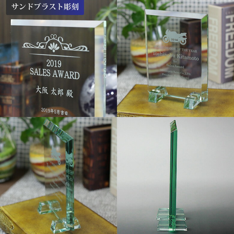 ●その他、クリスタル表彰盾一覧↓↓↓ 説 明 面取り加工された美しいグリーンのガラスにスタンドが取り付けられた美しい記念盾です。 名入れ無料でオリジナル商品が作成可能です。 ※【サンド彫刻は写真の加工は不可】 ※【台座部分は接着されています】 材 質 ソーダガラス サイズ 幅14cm×高19cm×奥5.5cm 包装 化粧箱入り 用 途 退職記念、定年退職、卒業記念、入学記念、周年記念、社内表彰、永年勤続表彰、優秀賞、ゴルフコンペ、ギフト 備考 オリジナル彫刻で世界でひとつだけのオリジナルトロフィーや盾が製作できます! ※価格に含まれるもの (商品代金・校正代金・彫刻代金) (ロゴマークなどデーターを作成する必要がある場合には 別途費用がかかる場合がございます。)