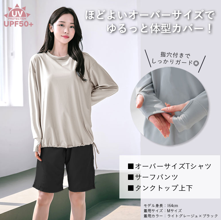 水着 レディース 長袖 4点セット 体型カバー オーバーサイズTシャツ 指穴 付き 紫外線遮蔽率99.9%以上 UVカット ラッシュガード サーフパンツ タンクトップ セット セパレート 膝丈 パンツ ロング かわいい おしゃれ タンキニ ママ水着 水陸両用 無地 ts008set4