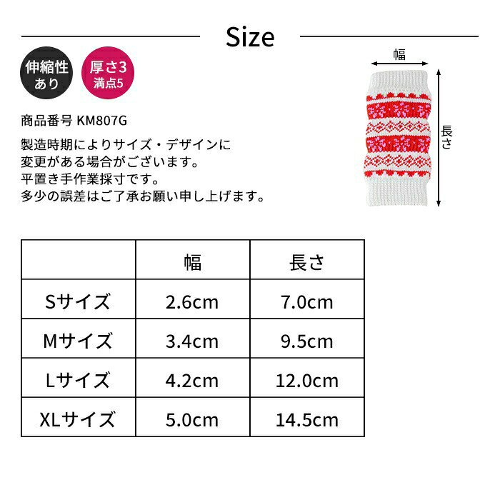 サイズは商品によって異なりますので、愛犬ちゃんの胸囲、背丈、首回りご確認の上ご購入を宜しくお願い致します。 【商品番号】KM807G 【サイズ】 S幅2.6/長さ7 M幅3.4/長さ9.5 L幅4.2/長さ12 XL幅5/長さ14.5 平置き手作業採寸です。多少の誤差はご了承お願い申し上げます。 【素材】綿75%、ポリエステル13%、ナイロン7%、ポリウレタン5% 【厚さ】3(満点5) 【伸縮性】3(満点5) 【コメント】 リブ編みレッグウォーマー 寒冷地や寒い季節に最適。 足元から温かさを提供し、寒さからくる不調を軽減します。 関節と膝のサポート 寒い日や硬い床面でのお散歩時、関節と膝を優しくサポート。 高い伸縮性 愛犬の足にしっかりフィット 自由な動きを妨げず、 快適な着用感を提供します。 いろんなシーンで活躍 寒い季節だけでなく、春や秋の夜のお散歩や、 冷房のきいた室内でも快適にお使いいただけます。 【ご注意】 製造時期によりサイズ・デザインに変更がある場合がございます。 画像のカラーは撮影時の照明等の具合により実物と異なる可能性がございます。 丁寧に検品しておりますが海外製品のため、日本製品に比べて生地キズや汚れ、糸のほつれなど裁縫の甘い部分があります。ご了承ください。 【キーワード】 #レッグウォーマー #防寒対策 #暖かい #可愛い #柔らかい #冬 #お散歩 #お出かけ #寒さ対策 #コーギー #フレンチブルドッグ #パグ #ボストンテリア #いぬ #犬 #プードル #ブルドッグ #中型犬 #小型犬 #フレブル #フレブル用 #ブヒ #フレブルサイズ #犬 #マルチーズ #トイプードル