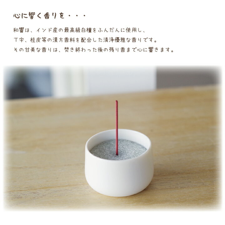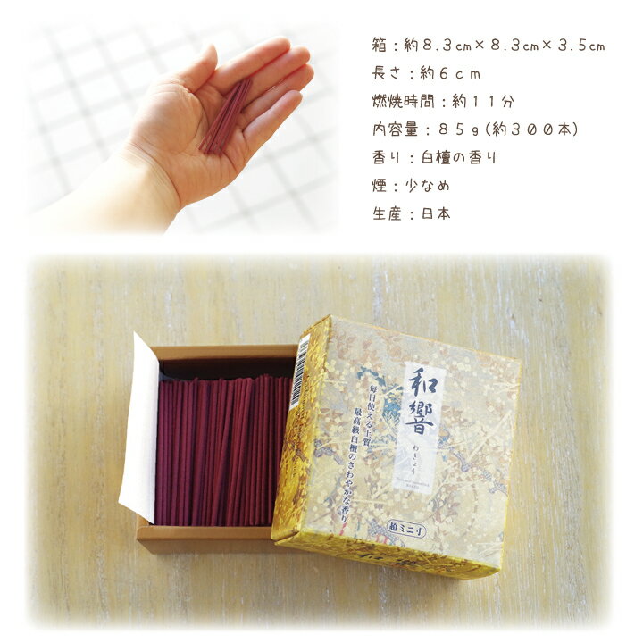 ペット仏具 線香 和響(わきょう) 超ミ二寸 最高級白檀を使用した、上質なお線香 インド産の最高級白檀をふんだんに使用し、桂皮等の漢方香料を使用した清浄優雅な香り。 白檀はとても高級なものですが、毎日のご供養にお使いいただけるよう大容量・リーズナブルに設定したお線香です。 超ミ二寸なので、小さなペット仏具にもお使いいただけます。 本物志向だったペットちゃんに特に手向けていただきたいお線香です。 『お香』と『お線香』の違い??? 『香』は、宗教的な用いられ方や嗜好品としての役割、又その時代によって、様々にかたちを変えてきました。 昔は、不浄な心と体の内を清めたり外から受けるのを防ぐために用いられたそうで、 供養の場面では、仏様に香の粉末を燃やして祈りを伝える『お焼香』として供えていたそうです。 時代を経て、『香』を線状に固めて燃やすようになったものが『線香』で、 供養する側が火種が要らず便利なので主流になったのだとか。 用途や形状によって呼び名が変わりますが、もとは同じもの。 仏様をもてなすときには『香』を『お線香』と呼び、香りを楽しむときには『香』を『お香』と呼ぶ、 と考えるのが良いようです。 一般に売られている『お香』と『お線香』に違いがあるとすれば、 『お香』は楽しむために香りが残り、『お線香』は毎日のことなのでほのかに香るものや 煙が少ないものが多いという点でしょうか。 香りで仏様となったペットちゃんをもてなすだけでなく、環境に合わせた形状のものや、 供養をすることでご自身も癒されるような香りの『香』を選んでいただくと良いでしょう。 また、ディアペットでは、【ミニ寸】お香・お線香をおすすしています。 ペットちゃんの仏具は小さなものが多いので、一般的なお線香ですと灰が外に落ちてしまうことがあるからです。 燃焼時間が短い分、火の元を気にせず毎日お線香を手向けることもできますね。 いろいろな種類がありますので、ペットちゃんも喜ぶようなお気に入りを見つけてください。 香り 白檀の香り 外箱サイズ 幅8.3cm×高さ8.3cm×奥行3.5cm 線香の長さ 6cm 内容量 約300本(85g) 燃焼時間 約11分 備考 日本製微煙 バリエーション ゴールド シルバー お線香やろうそく、お花、仏具など…ご友人やお知り合いのペットちゃんが亡くなった時に、お悔みのしるしとしてお贈りするのにふさわしいご供養品をご紹介しています。 ラッピングをご希望の方は「ラッピングサービス」のページをご覧いただき、ラッピングしたいお品物と一緒にカートに入れてご購入ください。